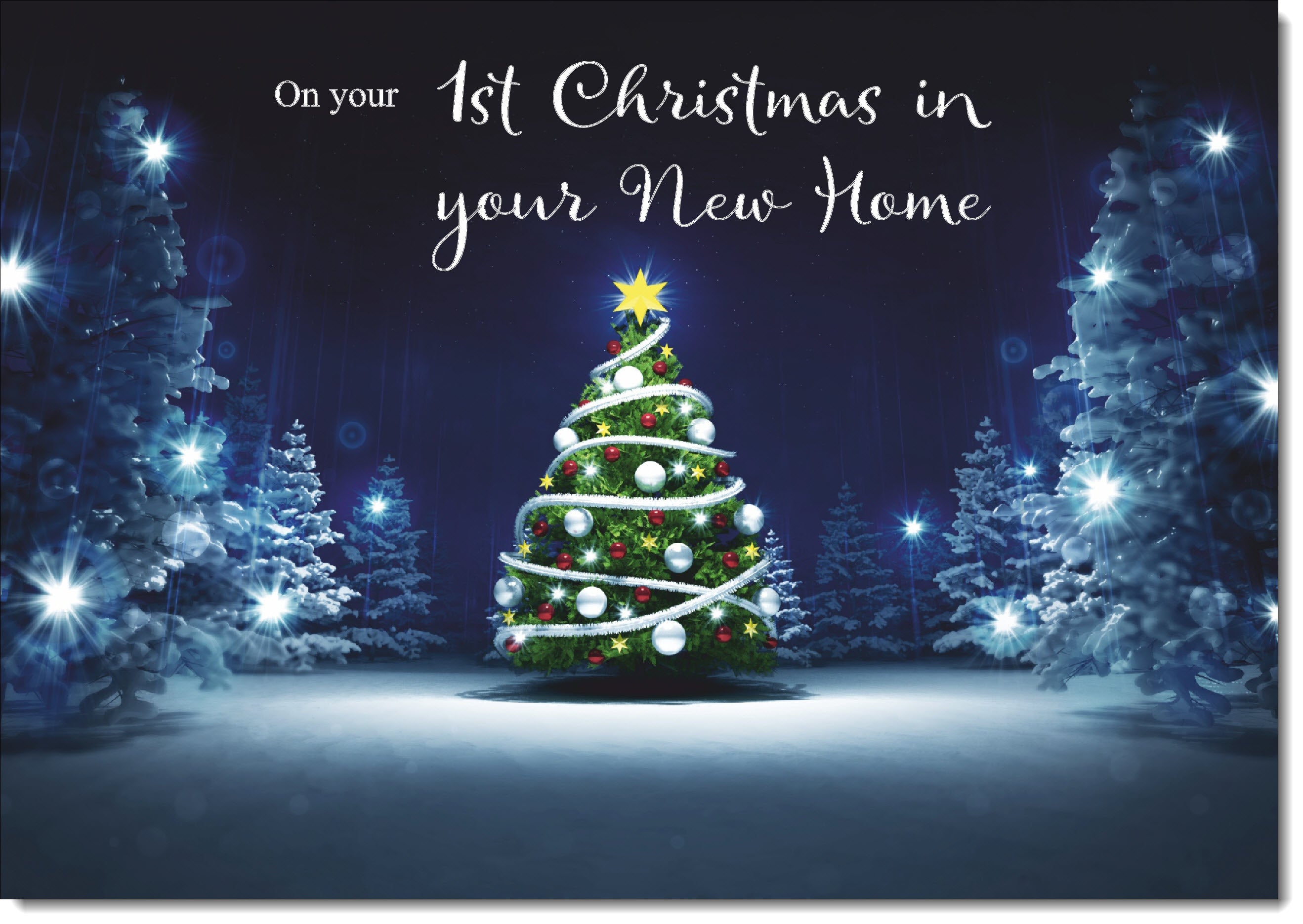 1st Christmas in New Home Card Christmas Tree Lights in Dark Sky
