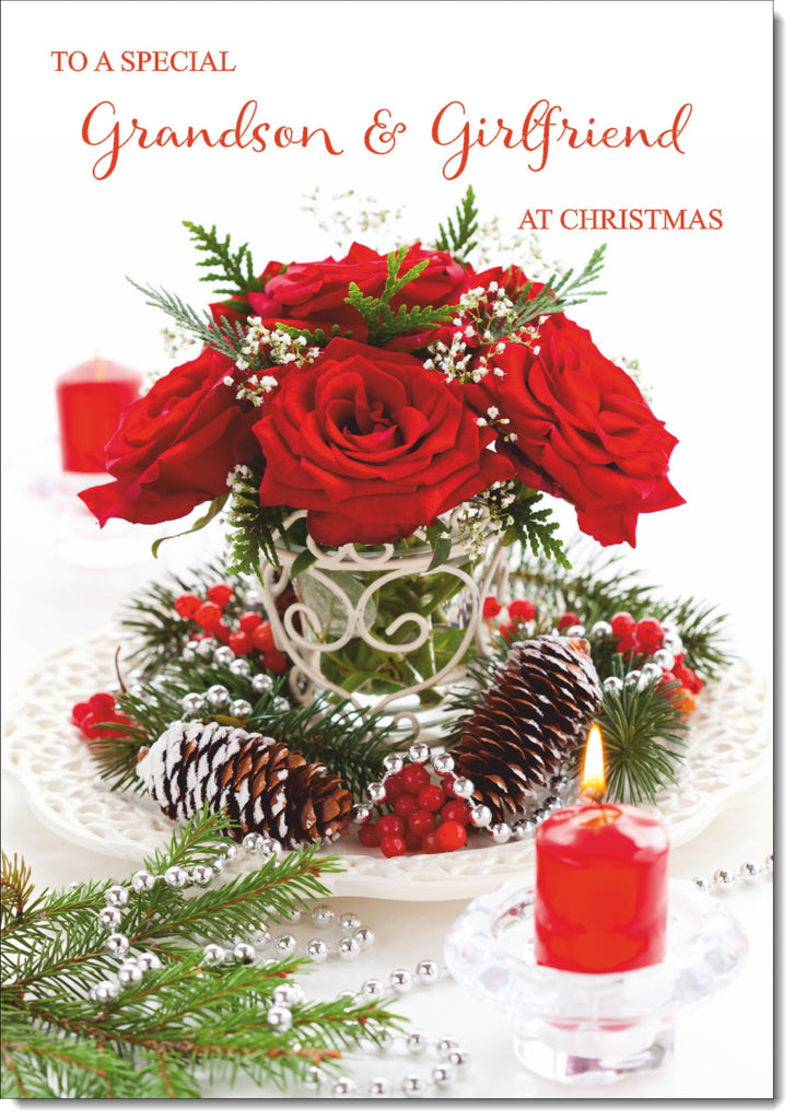 Grandson & Girlfriend Christmas Card Red Roses Christmas Arrangement