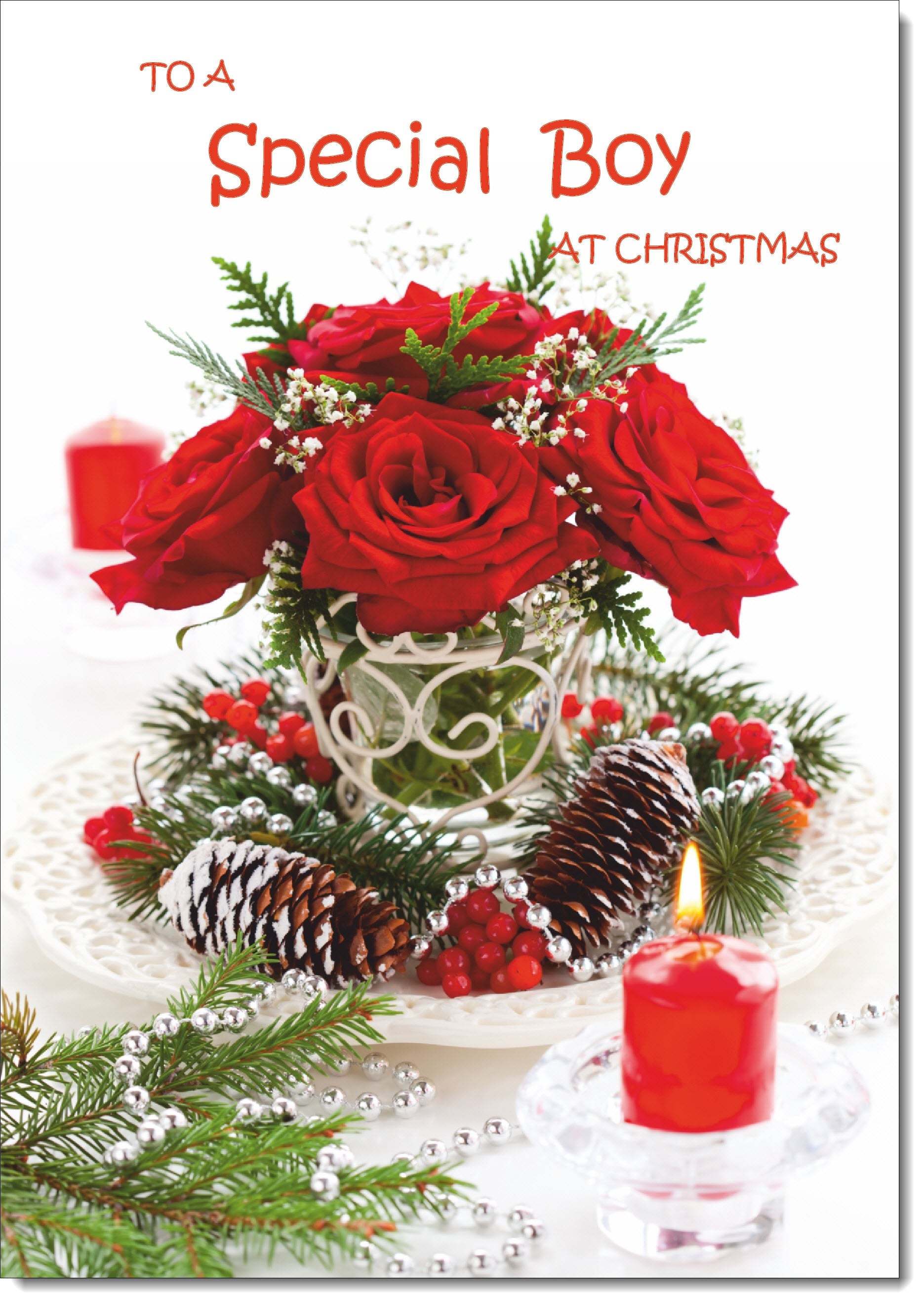 Special Boy Christmas Card Red Roses Christmas Arrangement