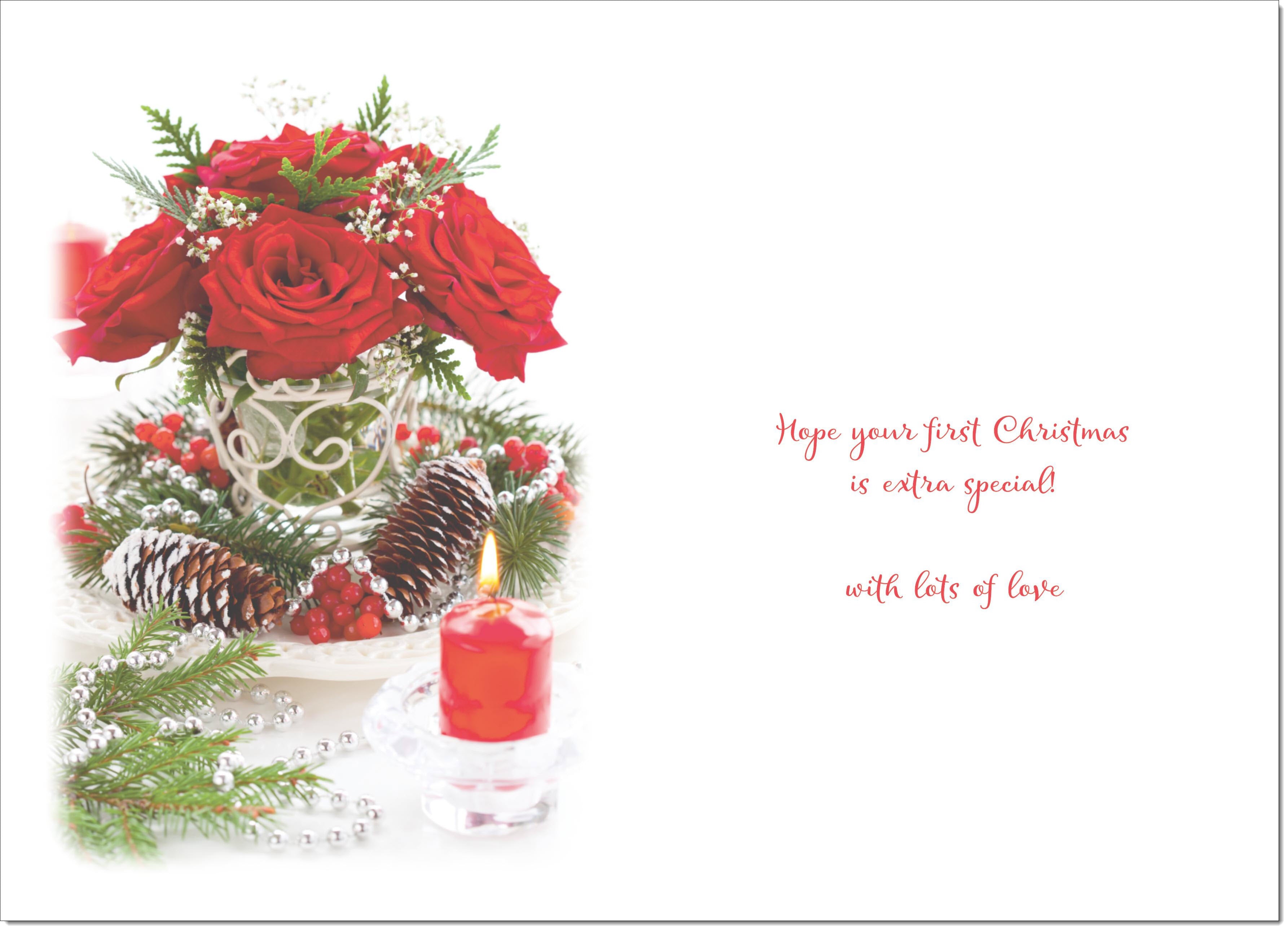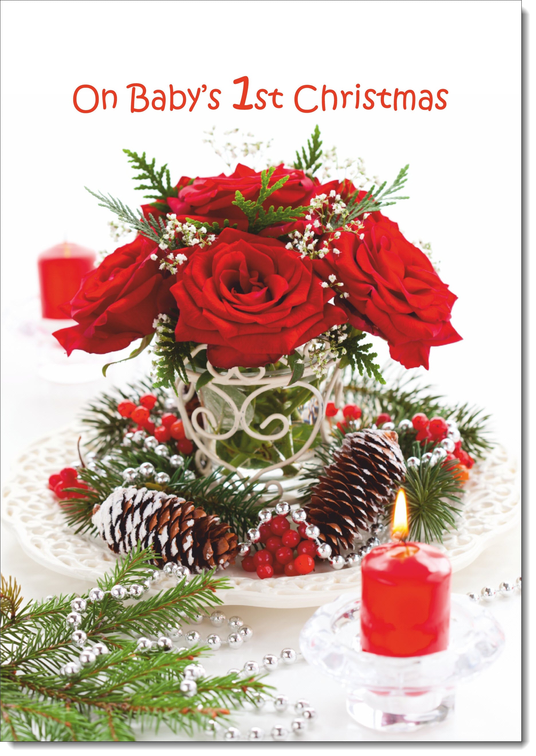 Babys 1st Christmas Card Red Roses Christmas Arrangement