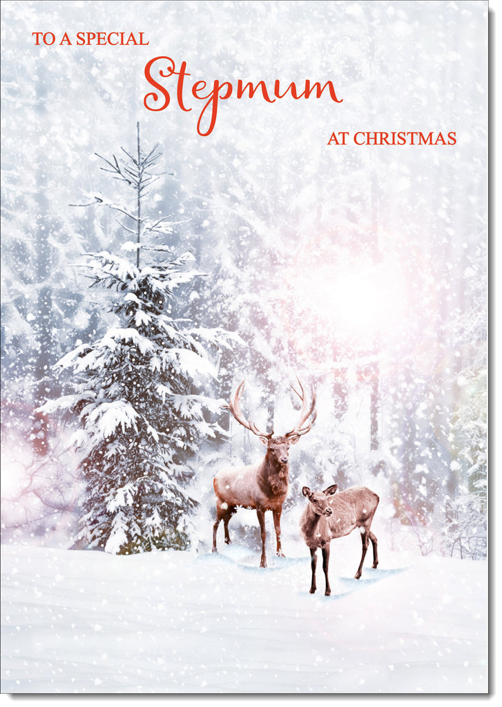 Stepmum Christmas Card Stag and Doe in Snowy Forest