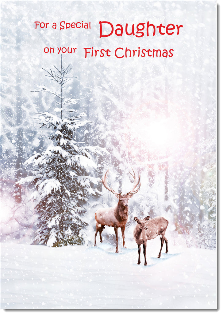 Daughter 1st Christmas Card Stag and Doe in Snowy Forest