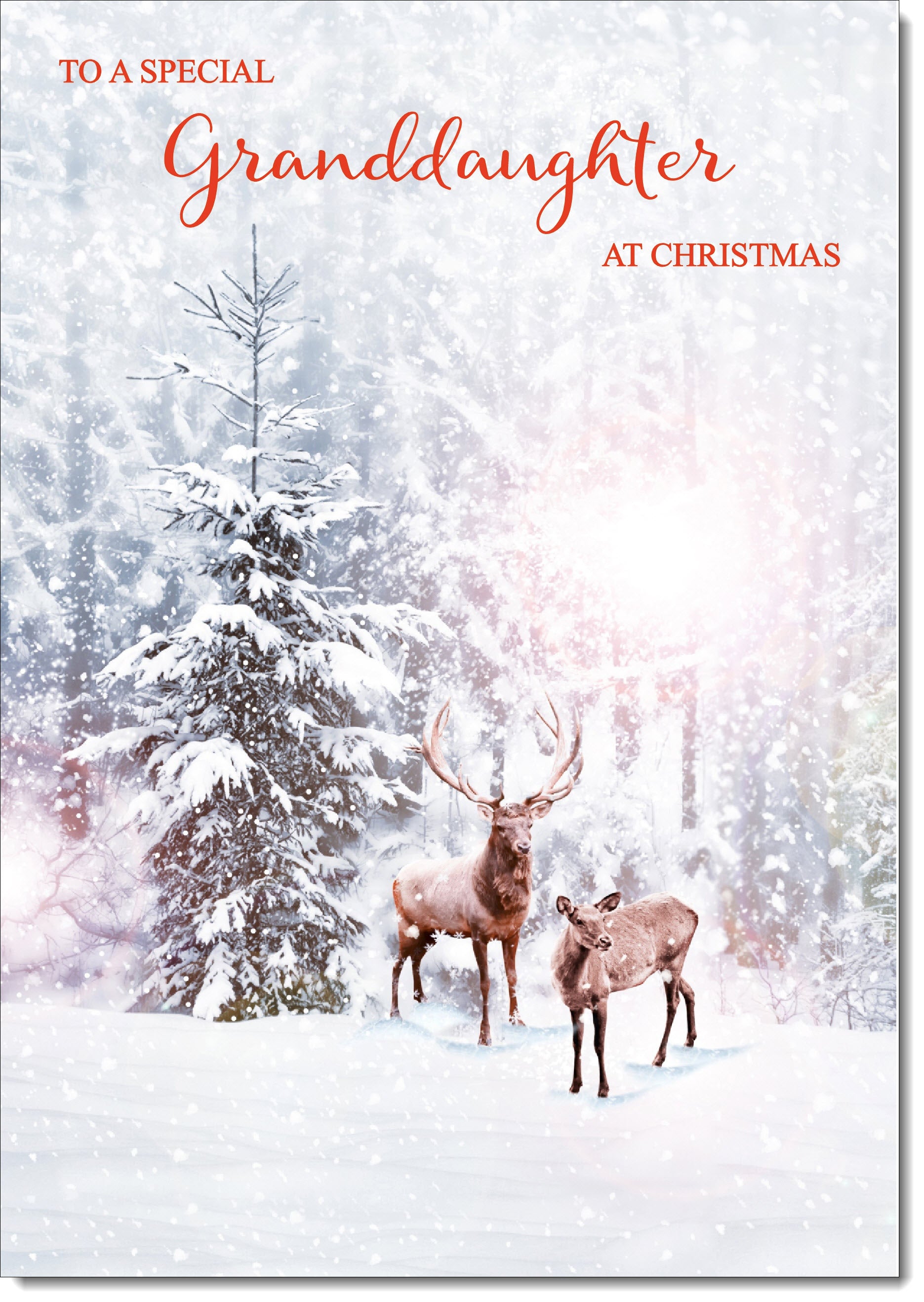 Granddaughter Christmas Card Stag and Doe in Snowy Forest