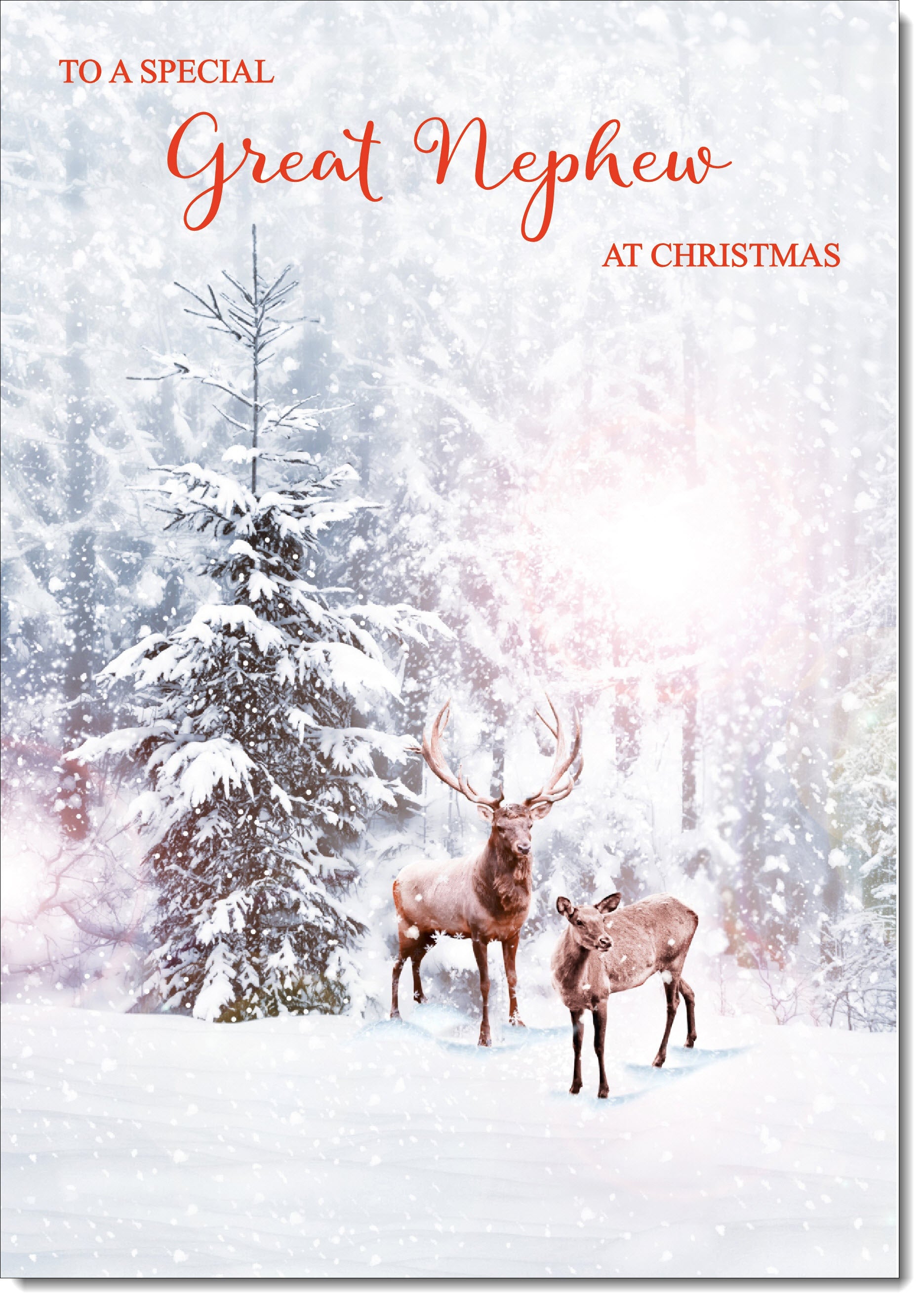 Great Nephew Christmas Card Stag and Doe in Snowy Forest