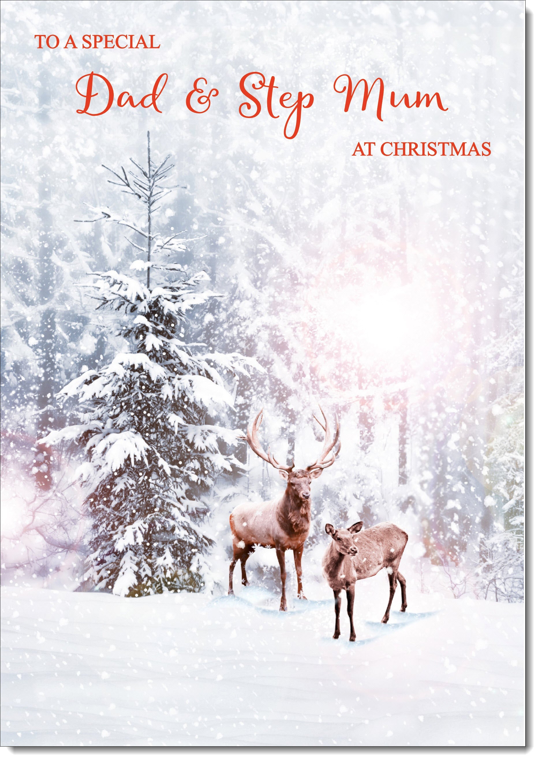 Dad & Stepmum Christmas Card Stag and Doe in Snowy Forest