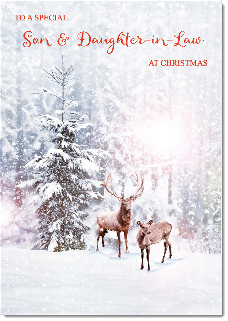 Son & Daughter-in-Law Christmas Card Stag and Doe in Snowy Forest