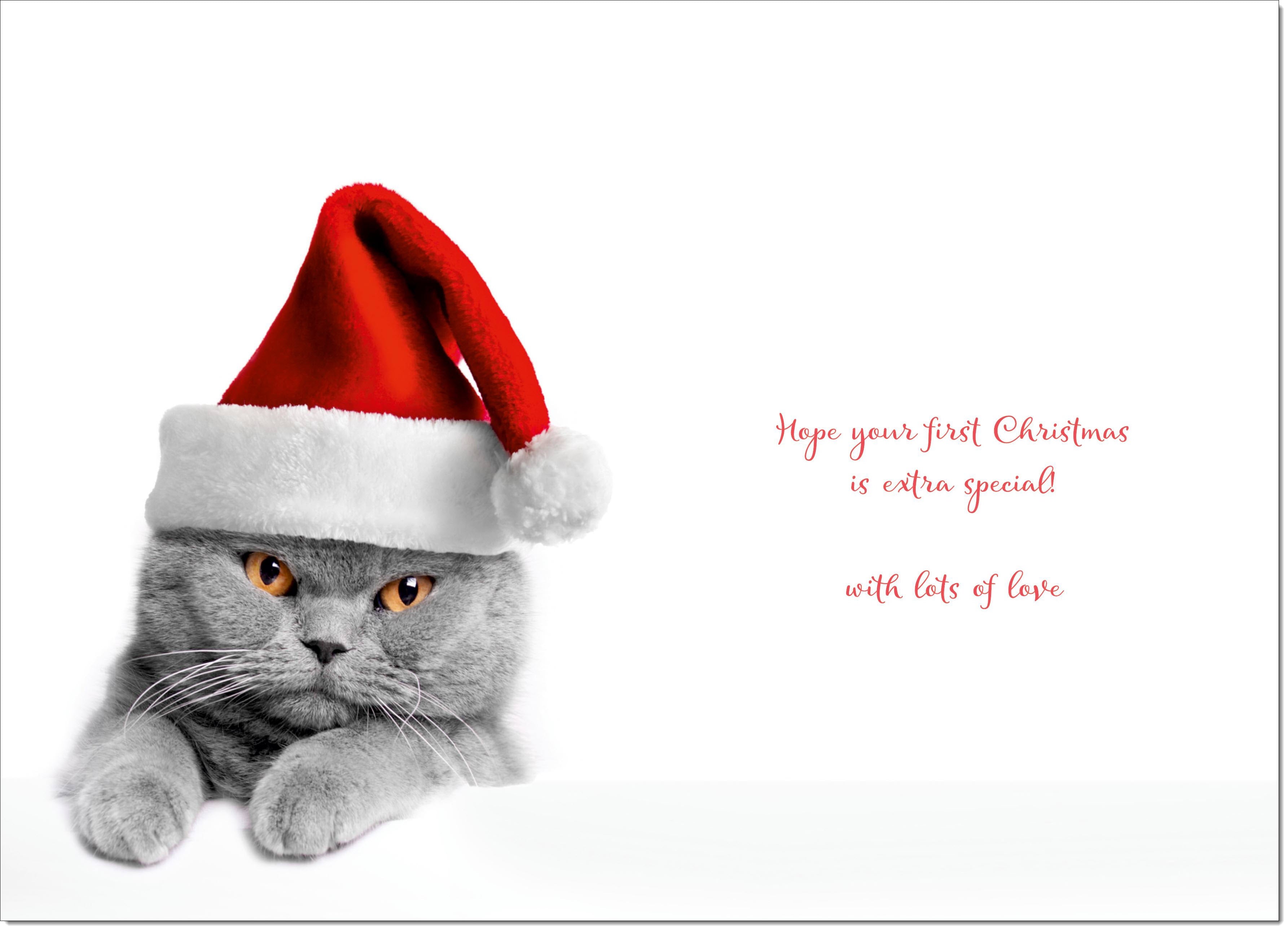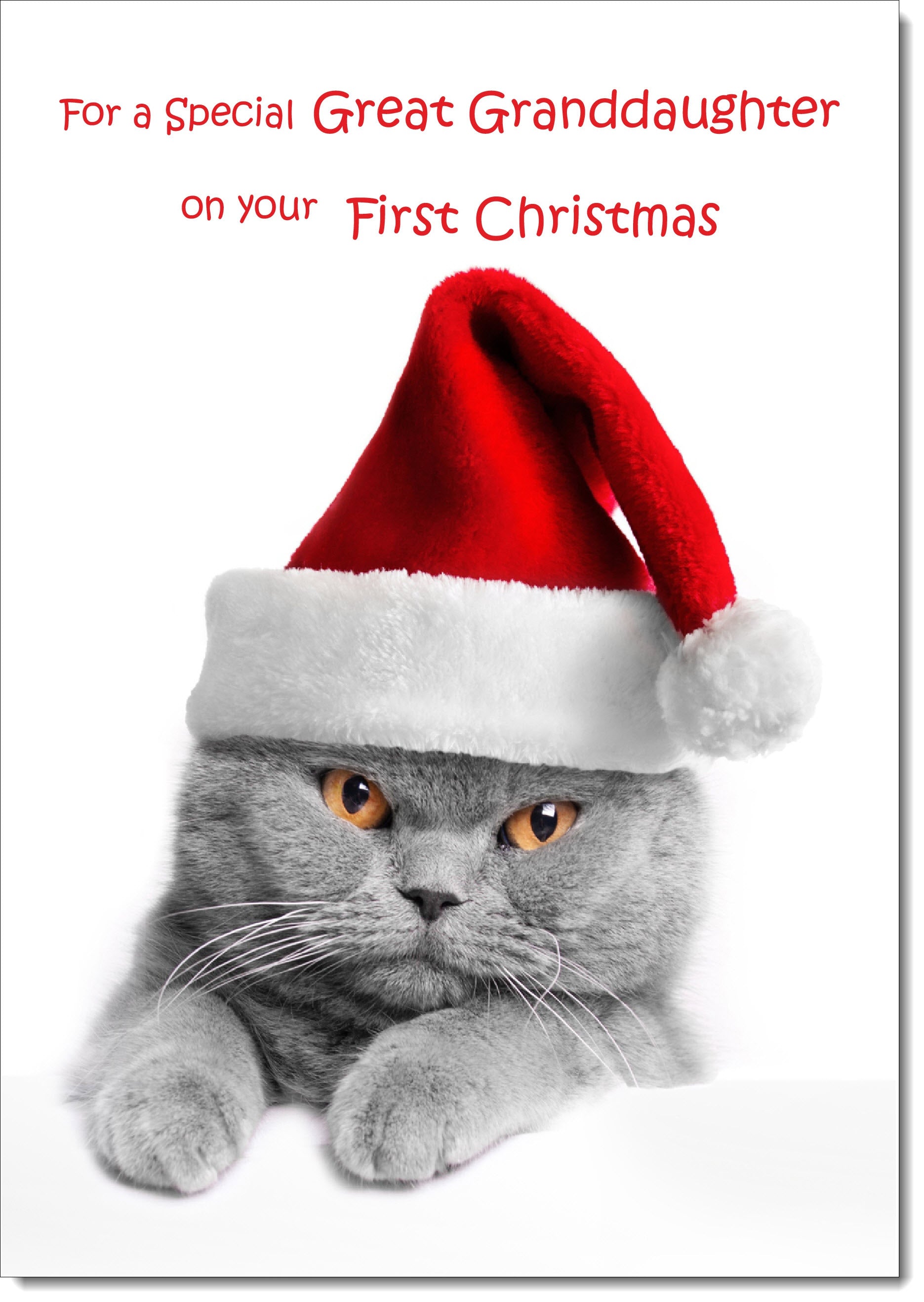 Great Granddaughters 1st Christmas Card Grey Cat with Santa Hat