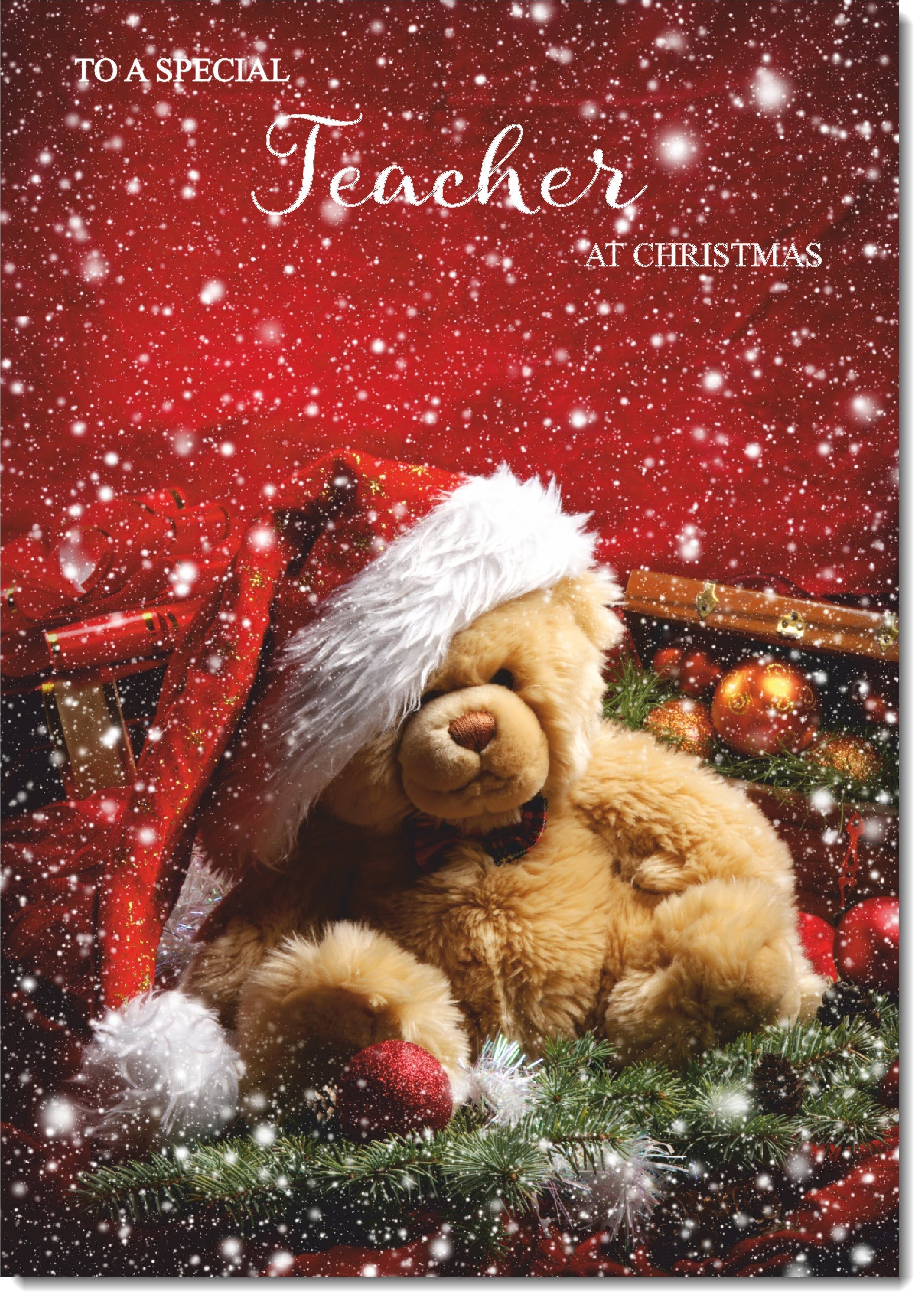 Teacher Christmas Card Teddy Bear in Santa Hat