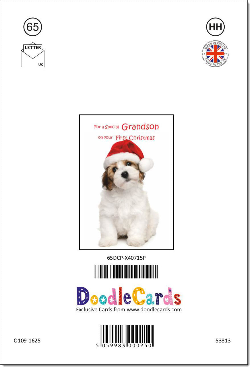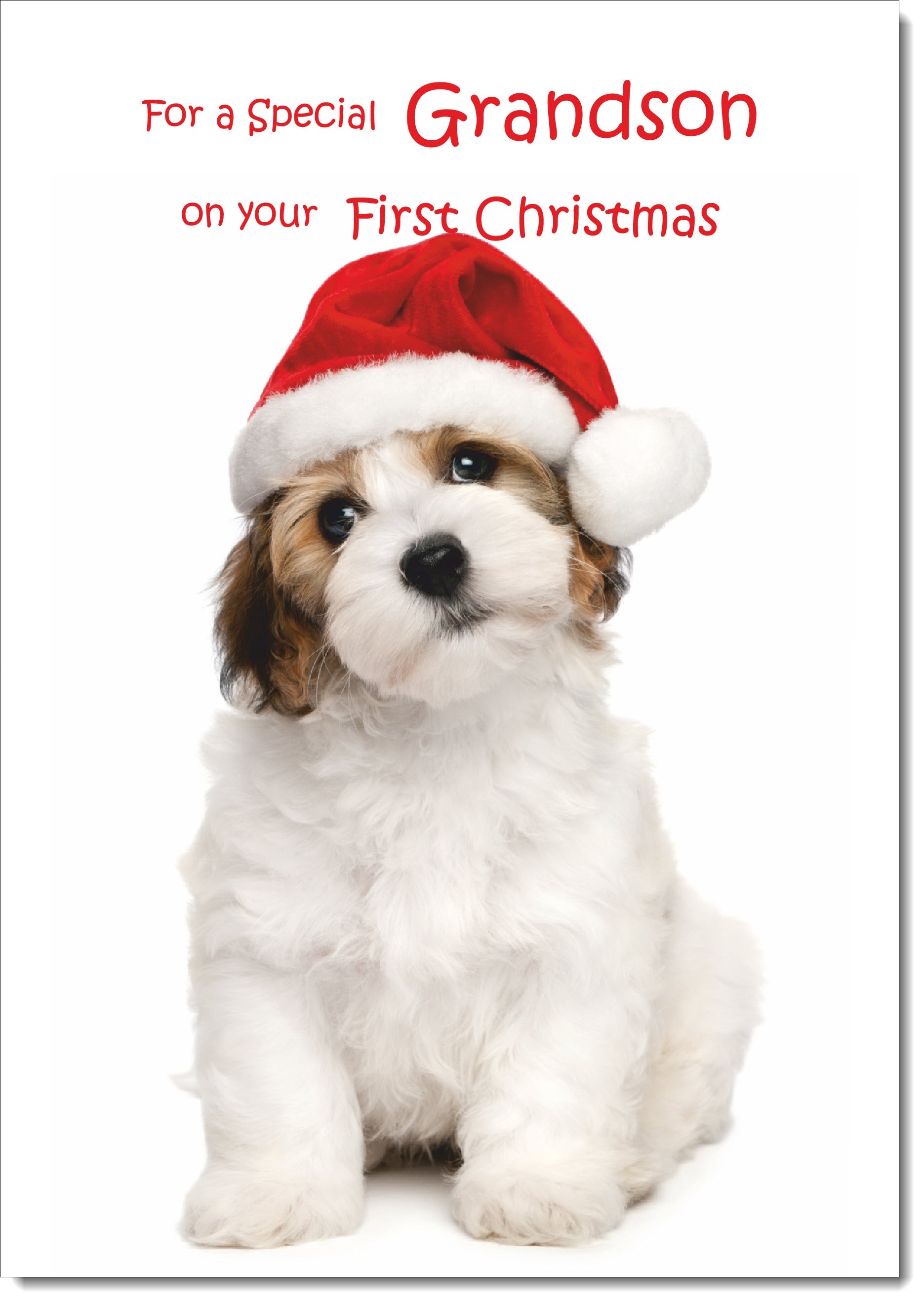 Grandsons 1st Christmas Card Dog and Santa Hat
