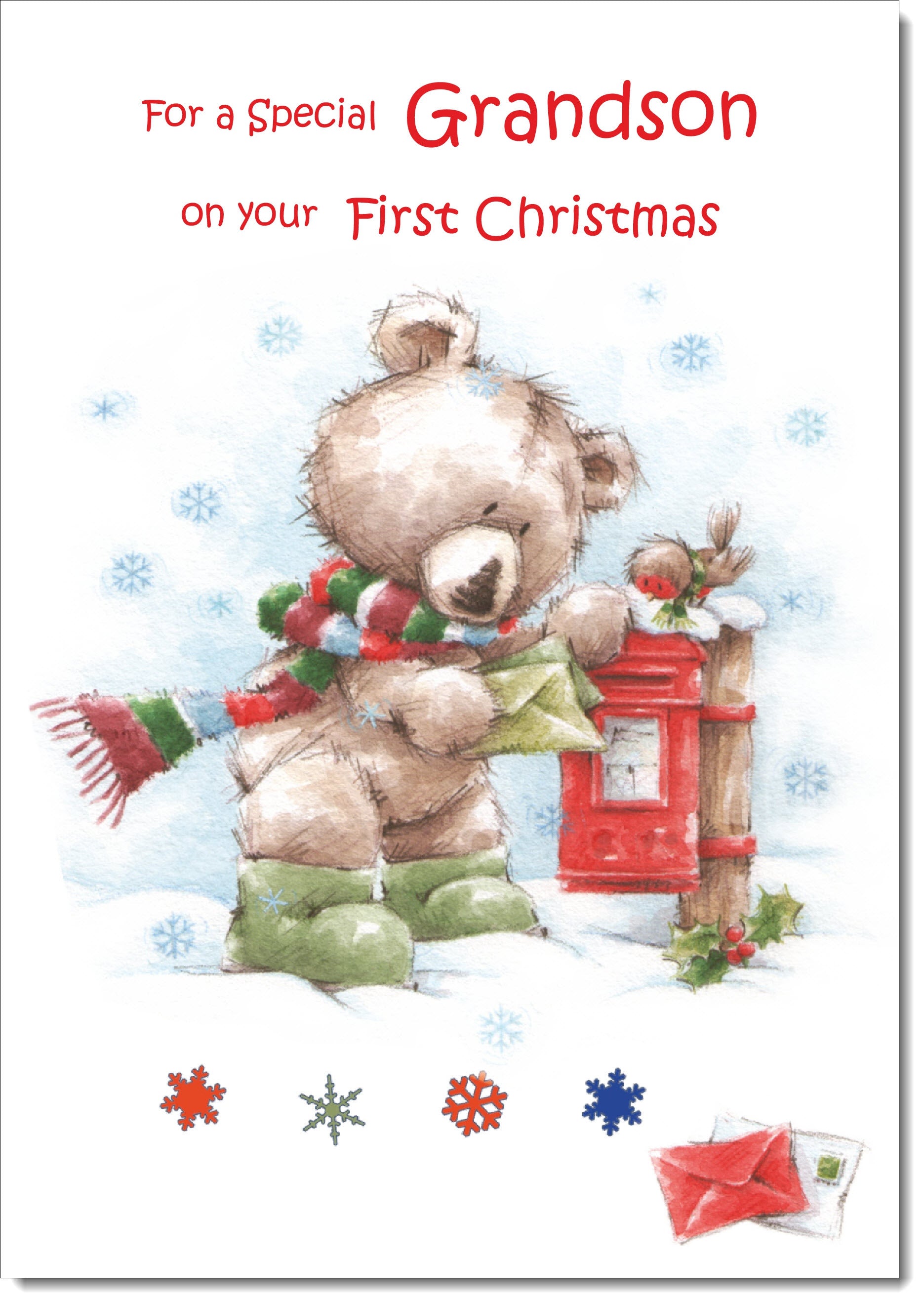 Grandsons 1st Christmas Card Cute Bear at Post Box