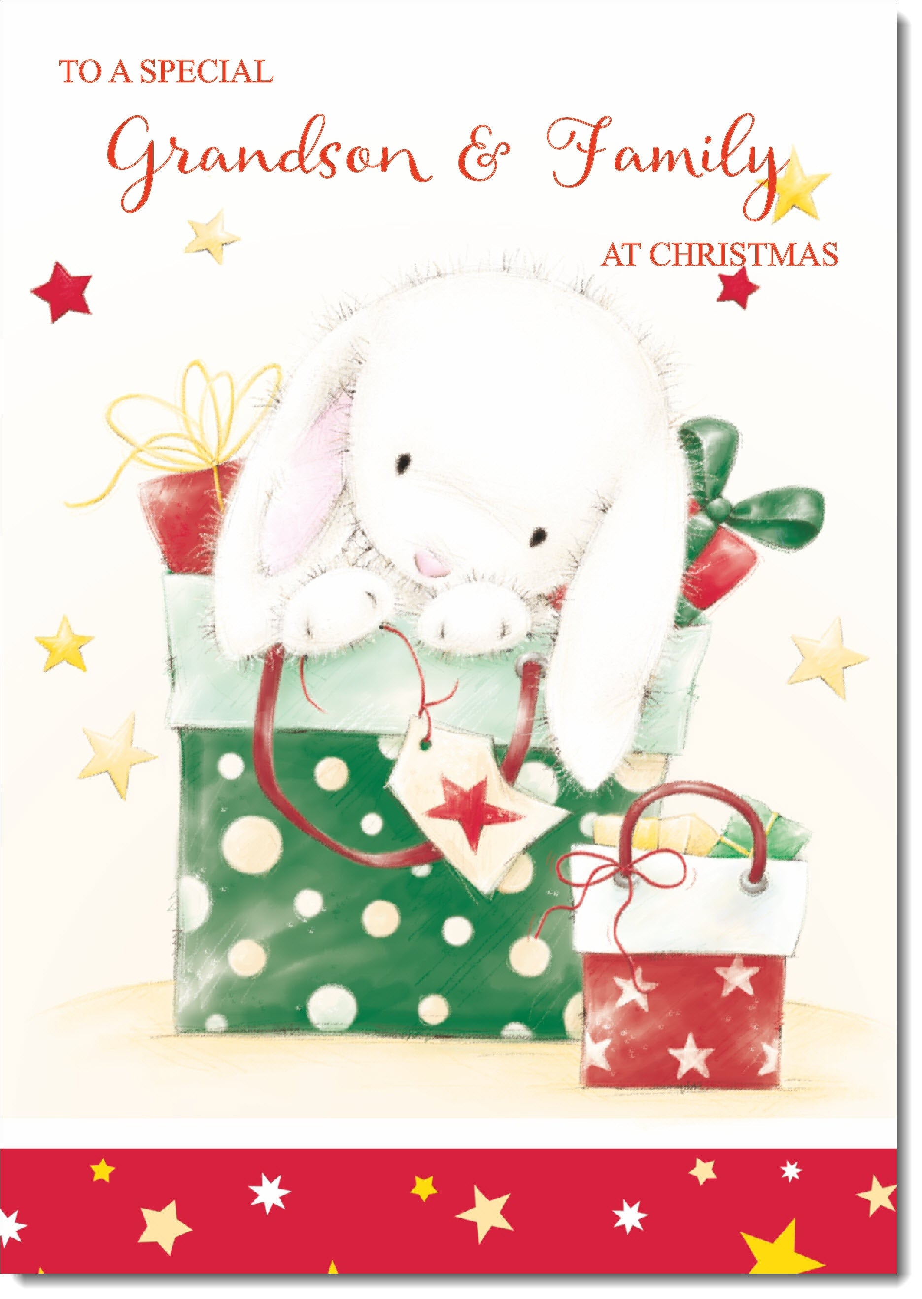 Grandson & Family Christmas Card Cute Rabbit with Parcels
