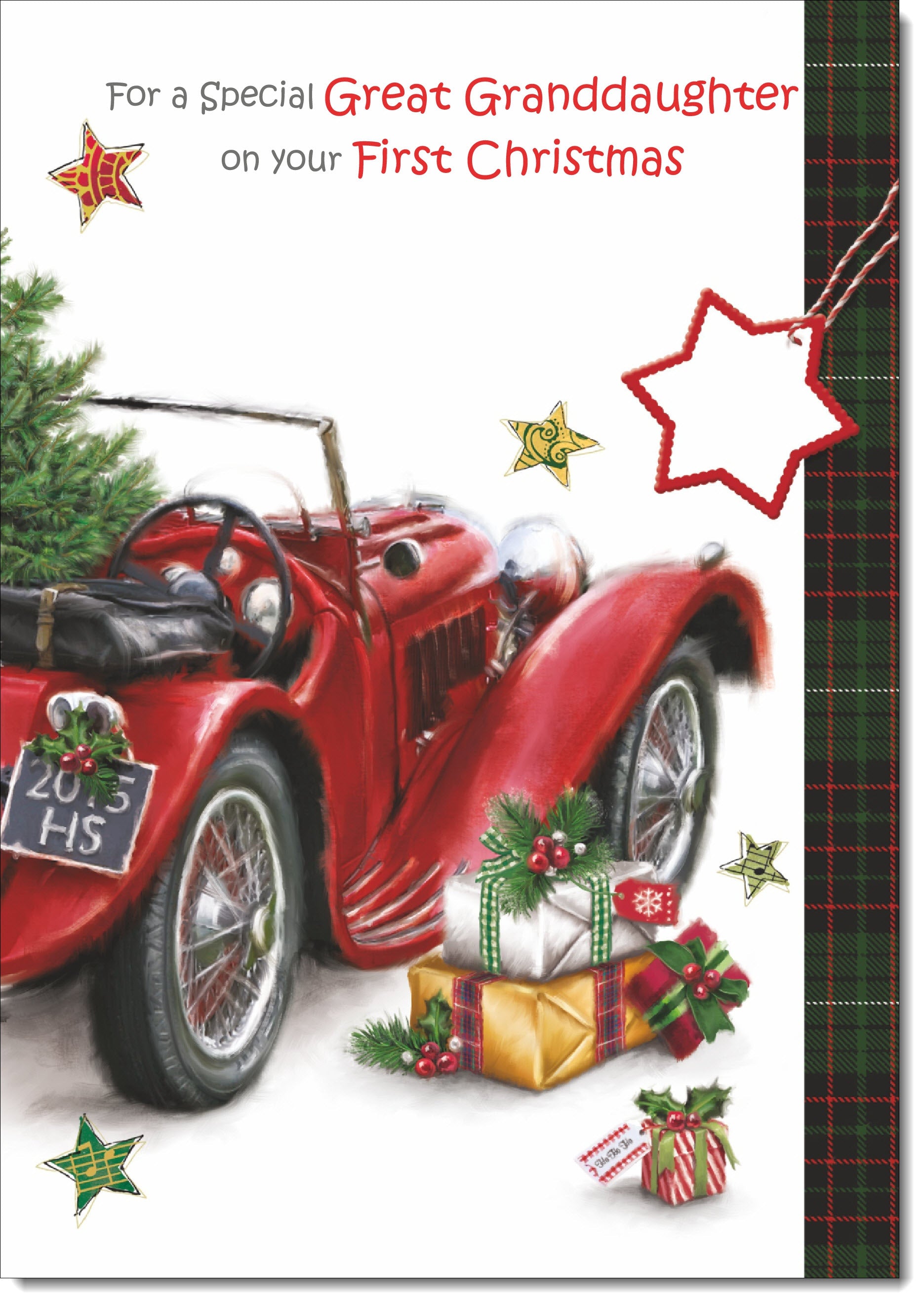 Great Granddaughters 1st Christmas Card Red Vintage Car
