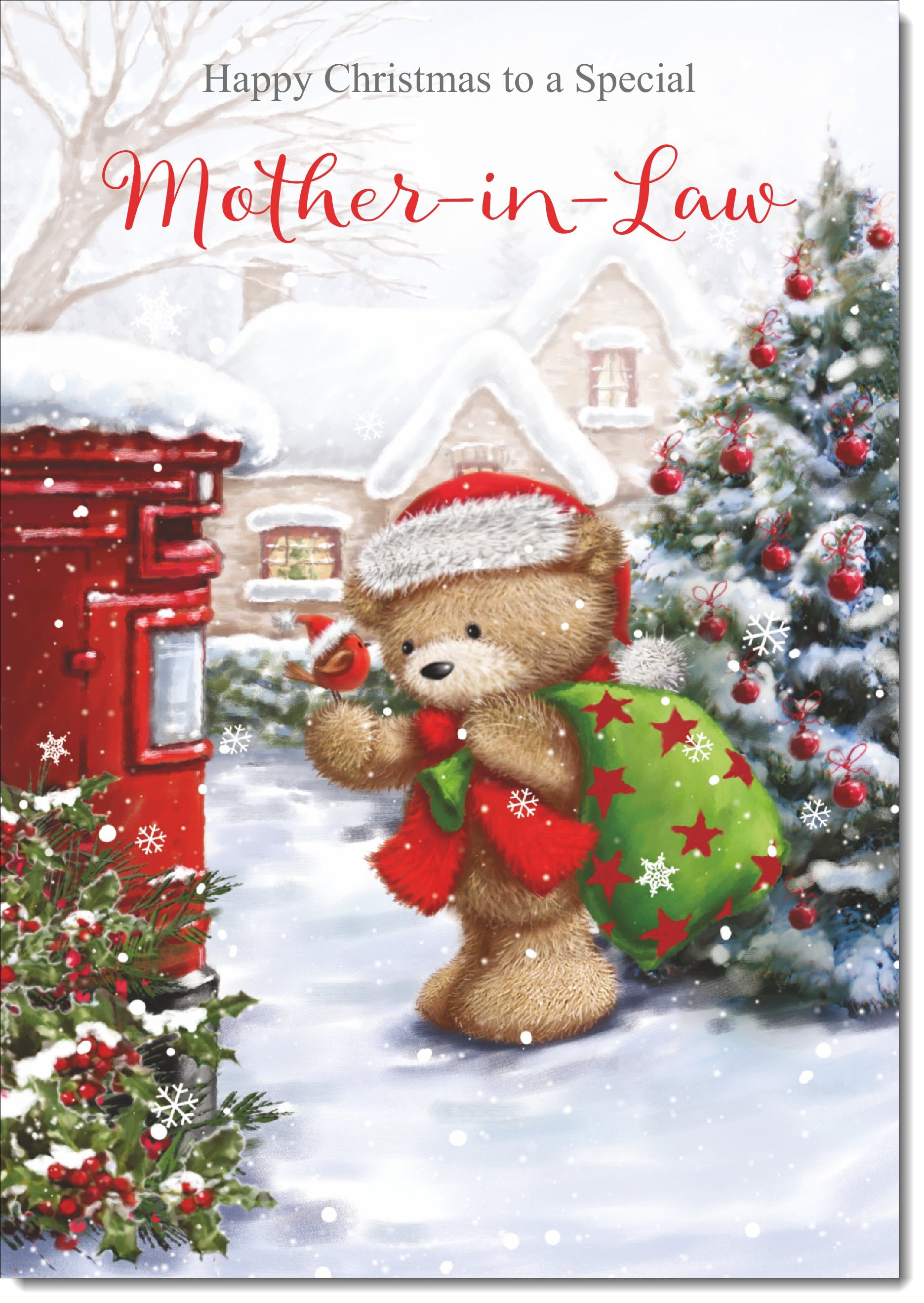 Mother-in-Law Christmas Card Cute Bear at Post Box