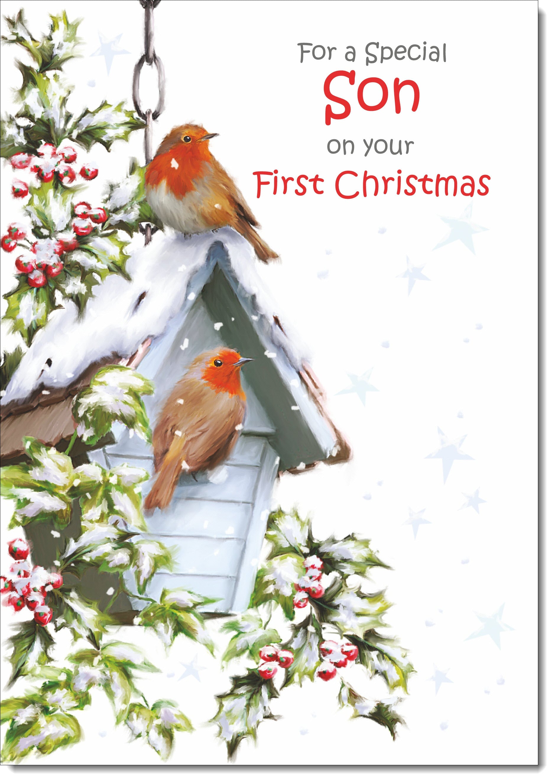 Sons 1st Christmas Card Two Robins in Snow