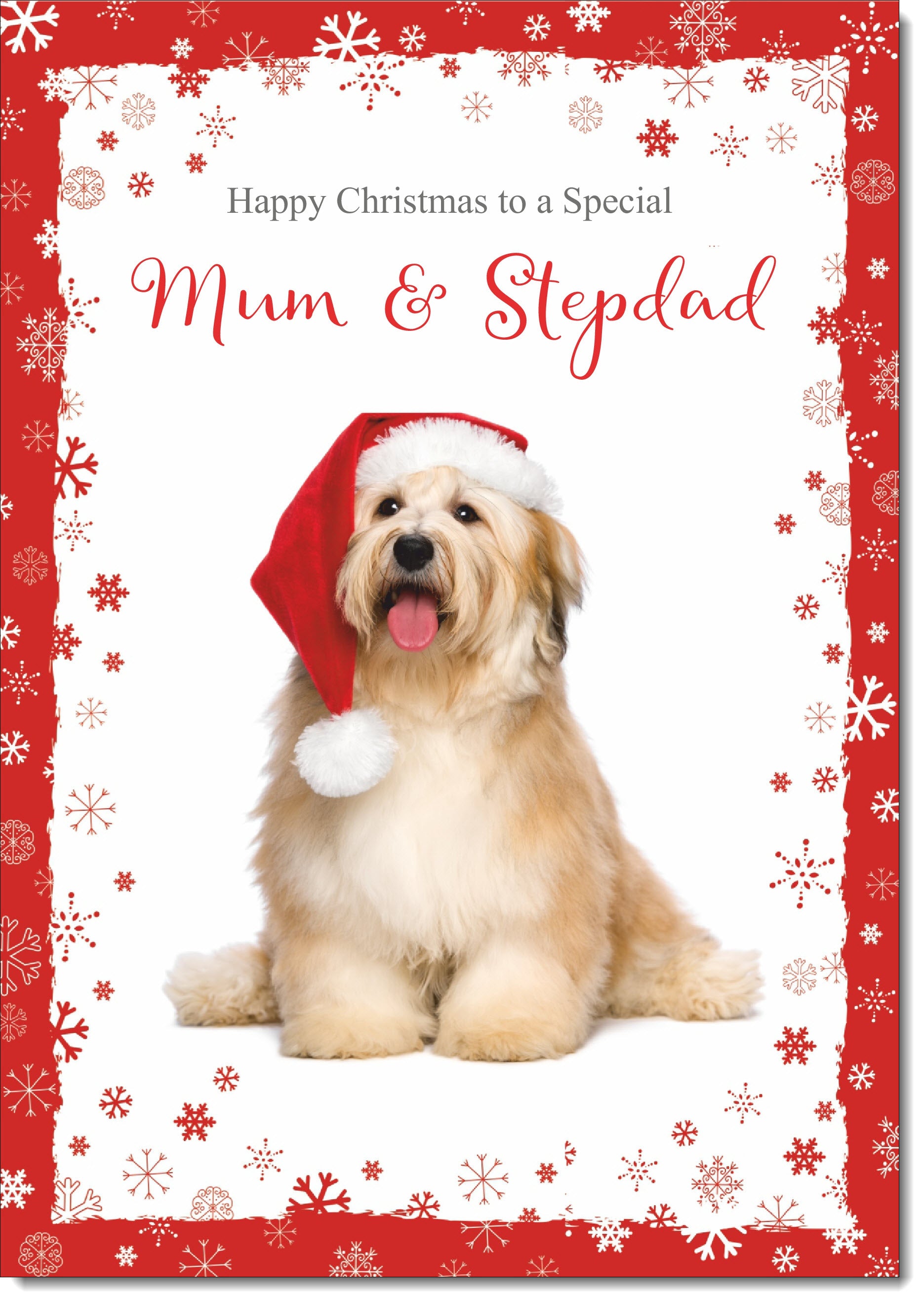 Mum & Stepdad Christmas Card Fluffy Dog in Santa Hat
