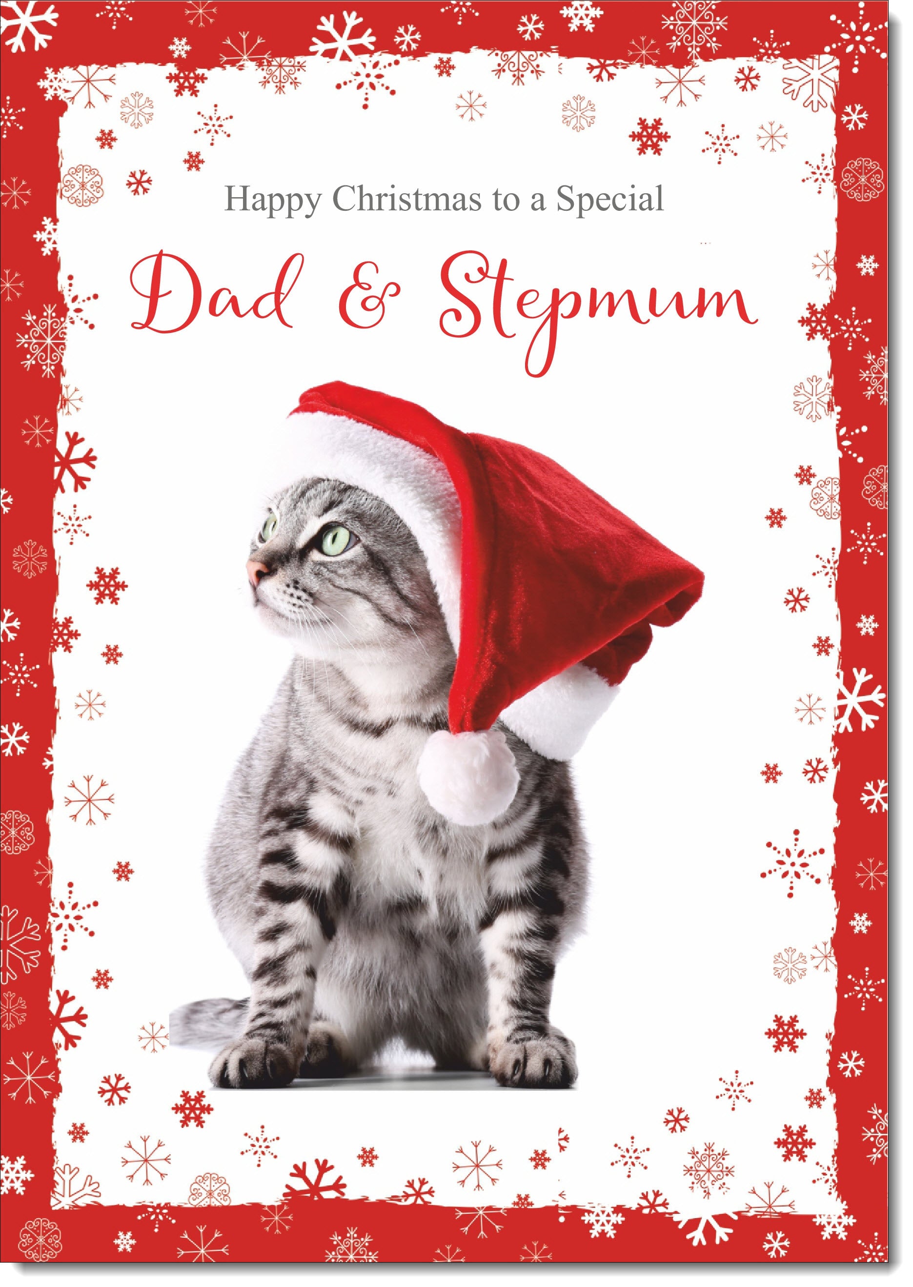 Dad & Stepmum Christmas Card Cat with Santa Hat