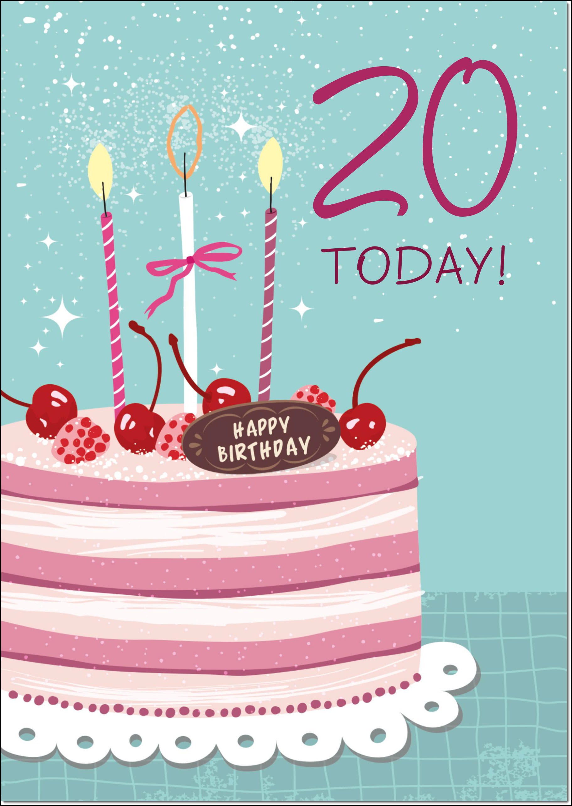 20th Birthday Card Age 20 for Her Cherry Birthday Cake and Candles