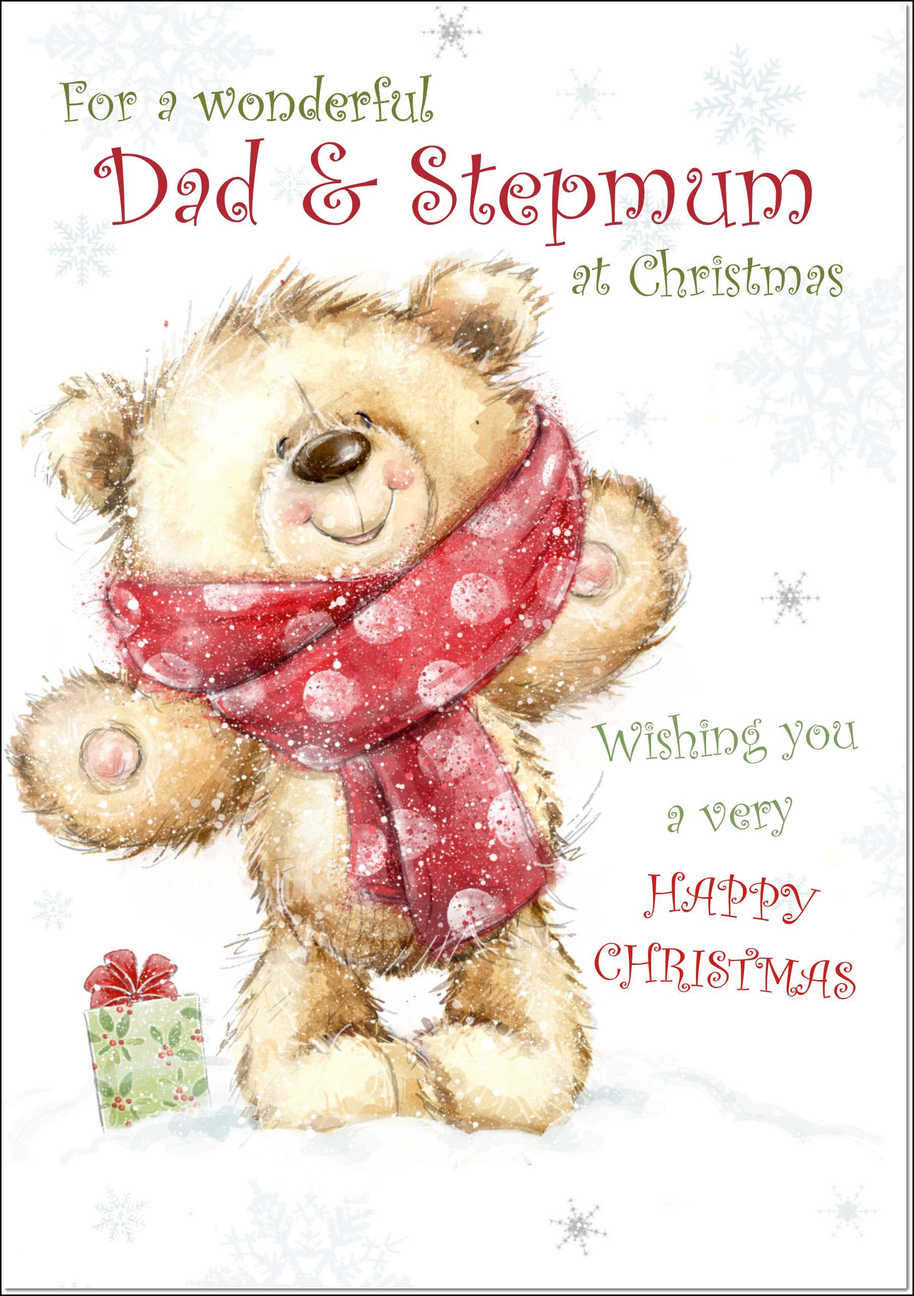 Dad & Stepmum Christmas Card Teddy Bear With Red Scarf