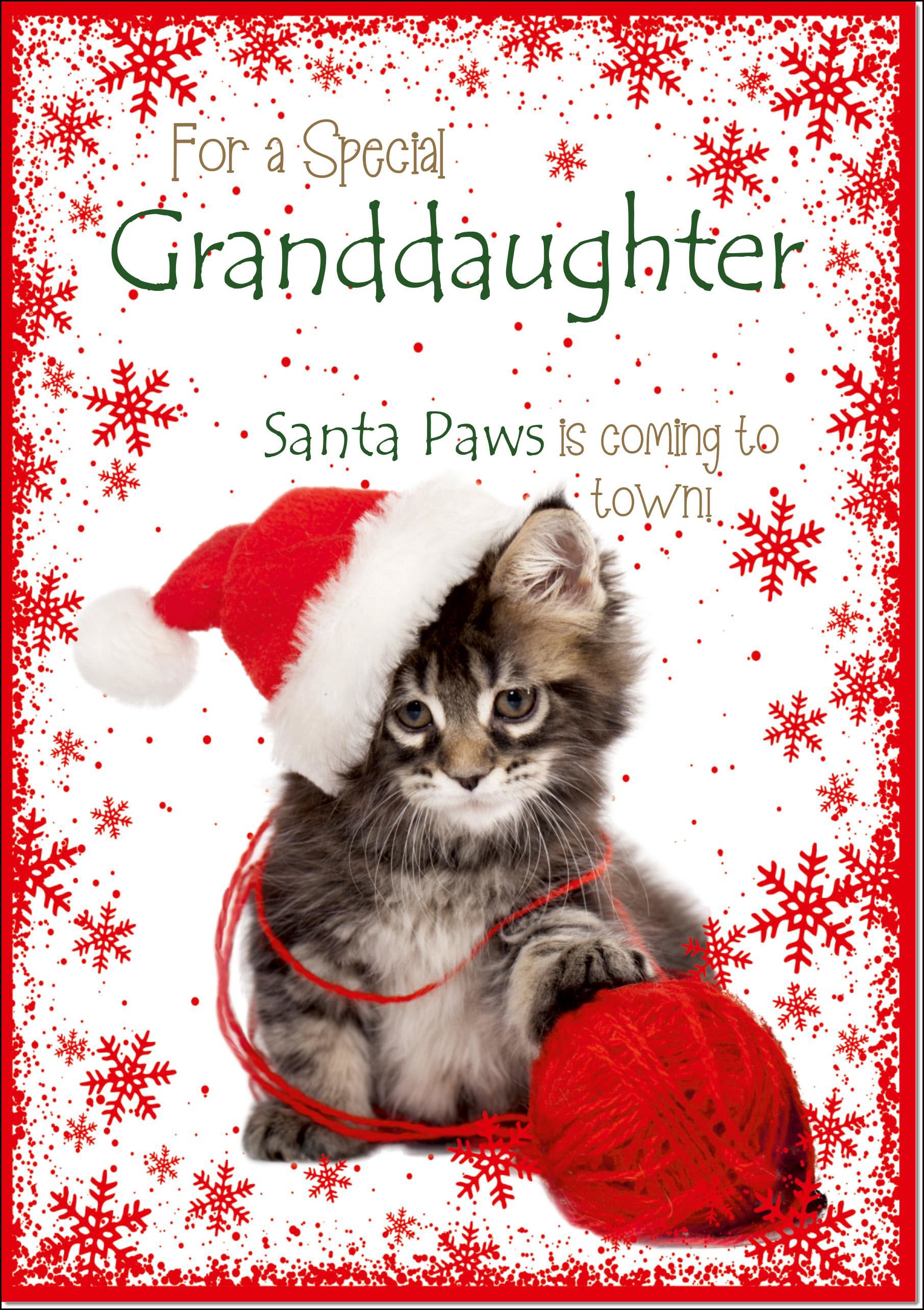 Granddaughter Christmas Card Cute Santa Paws Kitten Cat Pet