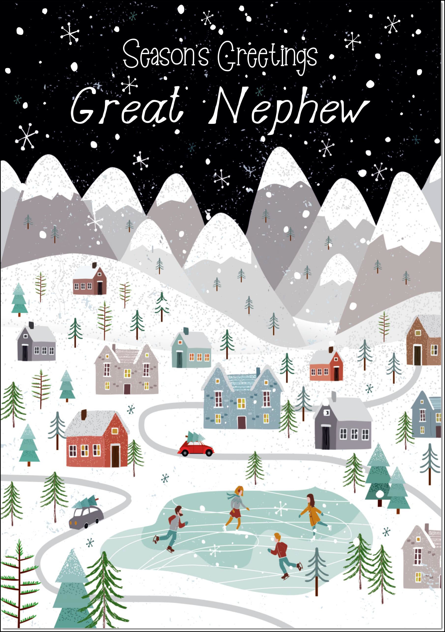 Great Nephew Christmas Card Mountain Scene In Snowy Village