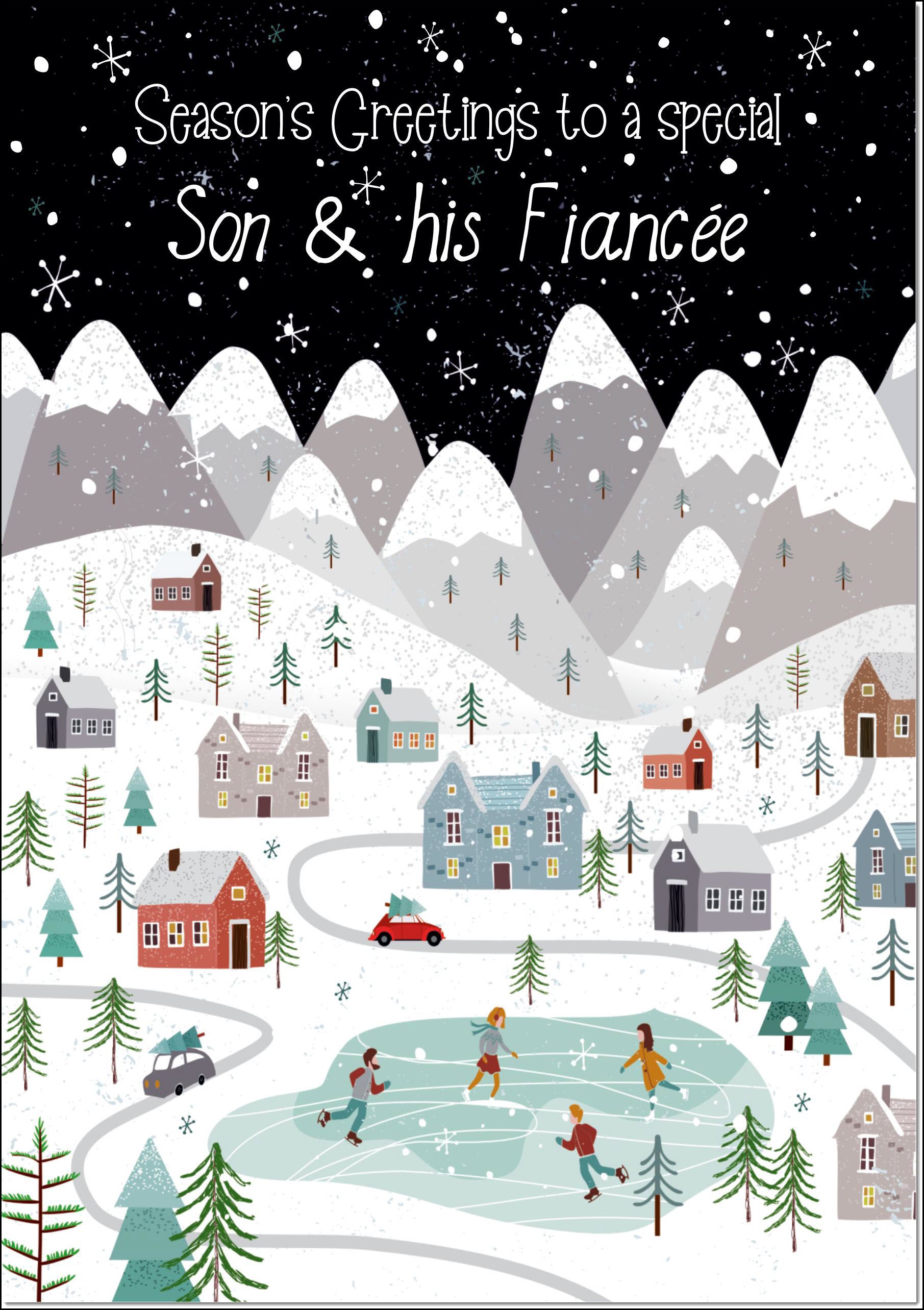Son & Fiancee Christmas Card Mountain Scene In Snowy Village