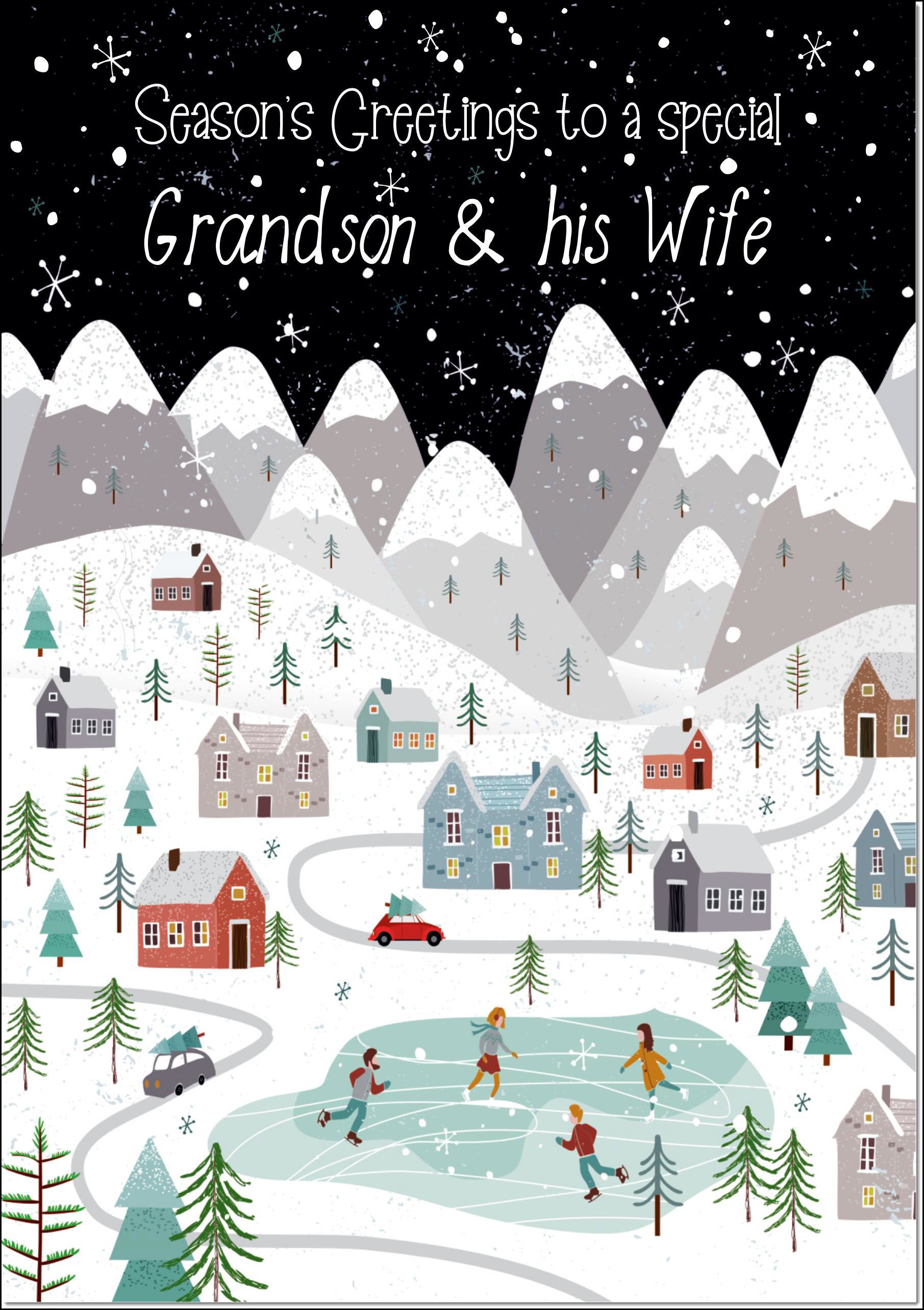 Grandson & Wife Christmas Card Mountain Scene In Snowy Village