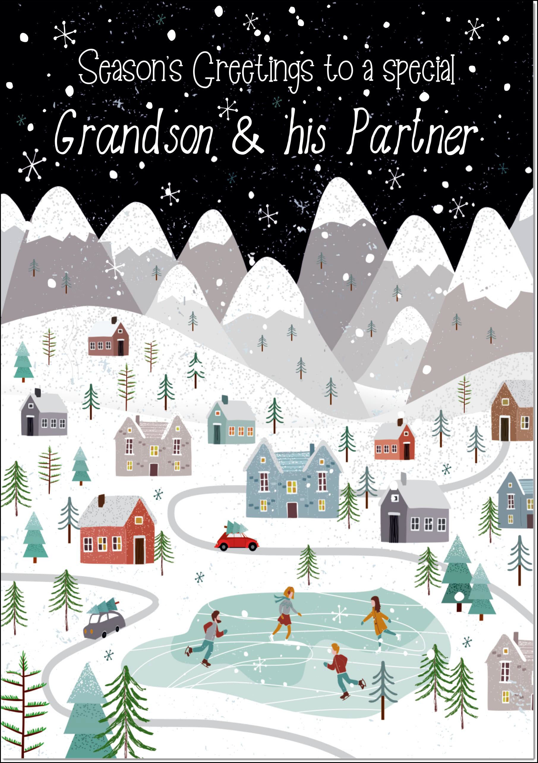 Grandson & Partner Christmas Card Mountain Scene In Snowy Village