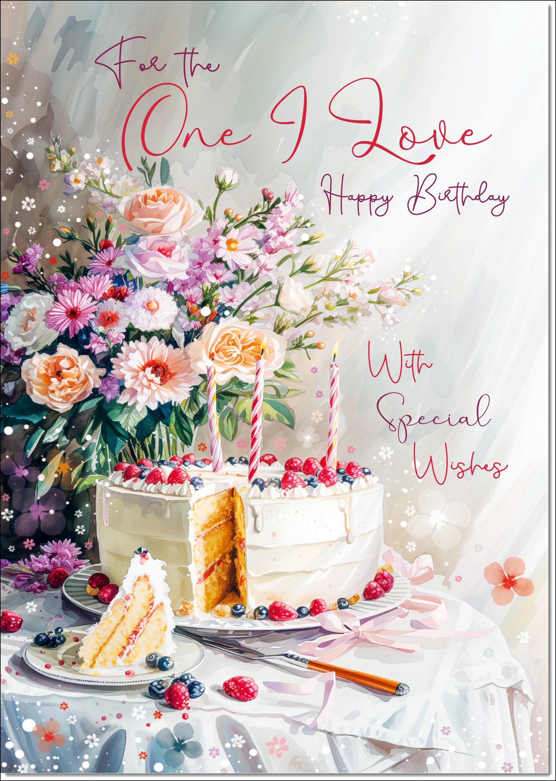 One I Love Birthday Card for Her Birthday Cake and Flowers