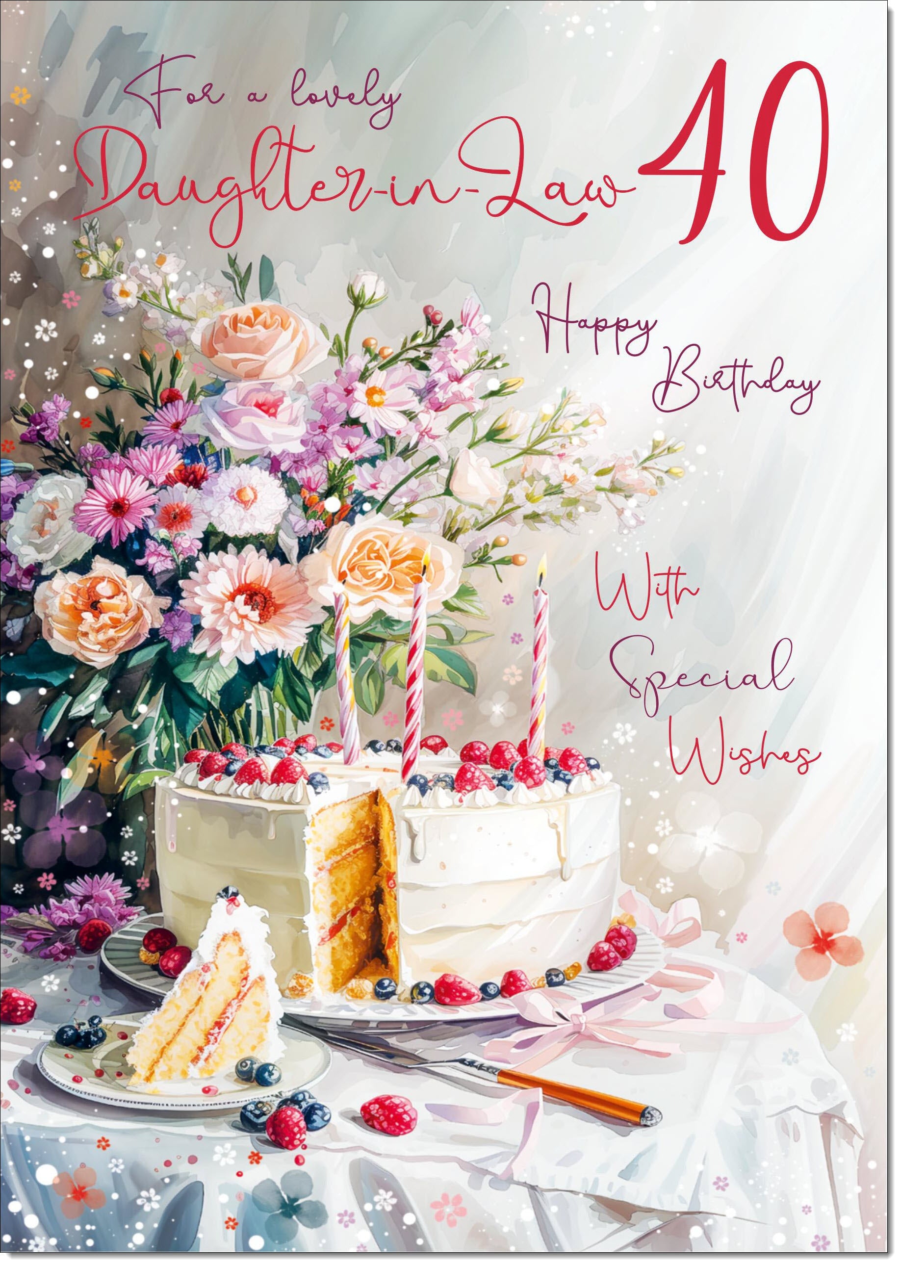 Daughter-in-Law 40th Birthday Card Age 40 Birthday Cake and Flowers