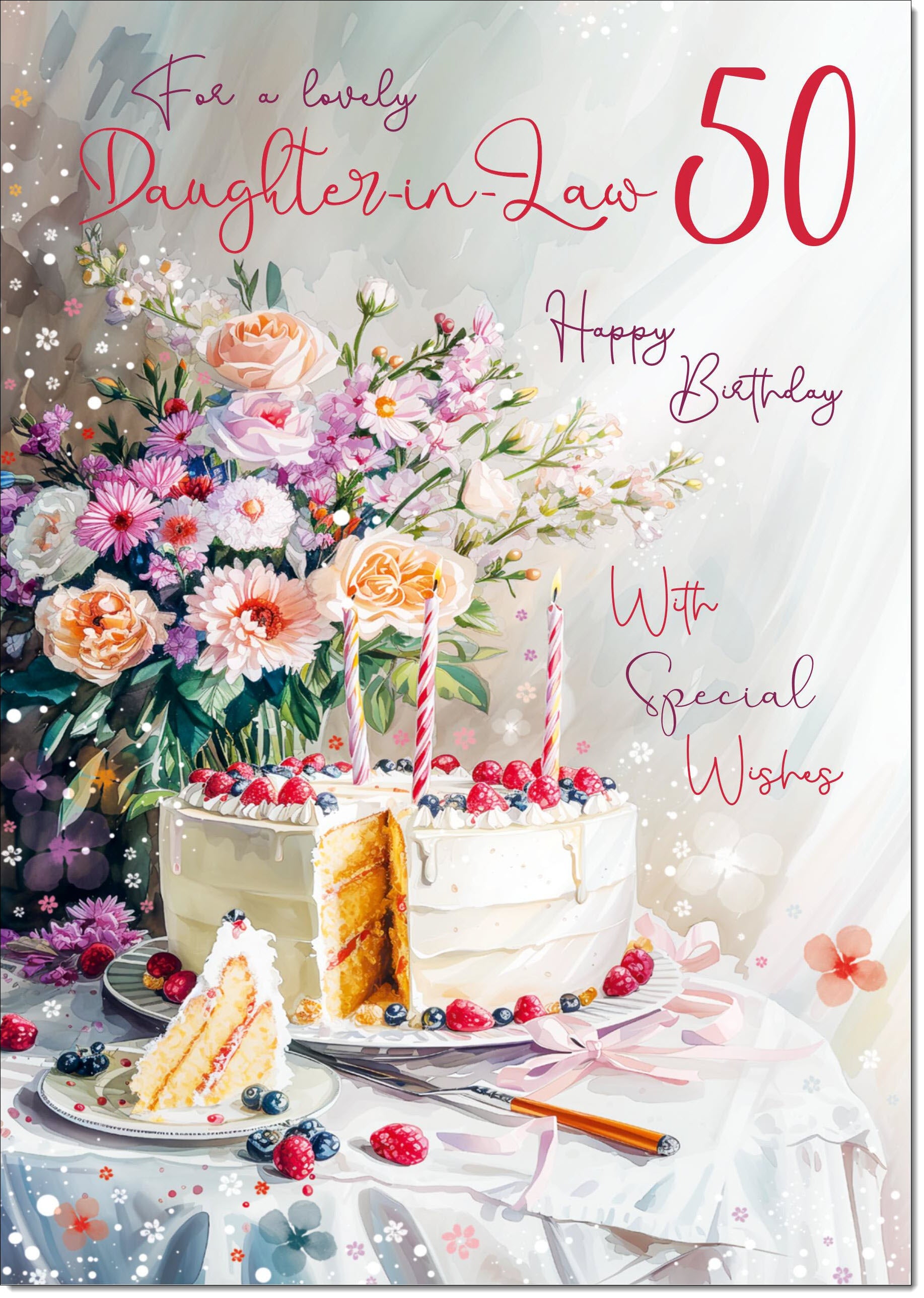 Daughter-in-Law 50th Birthday Card Age 50 Birthday Cake and Flowers