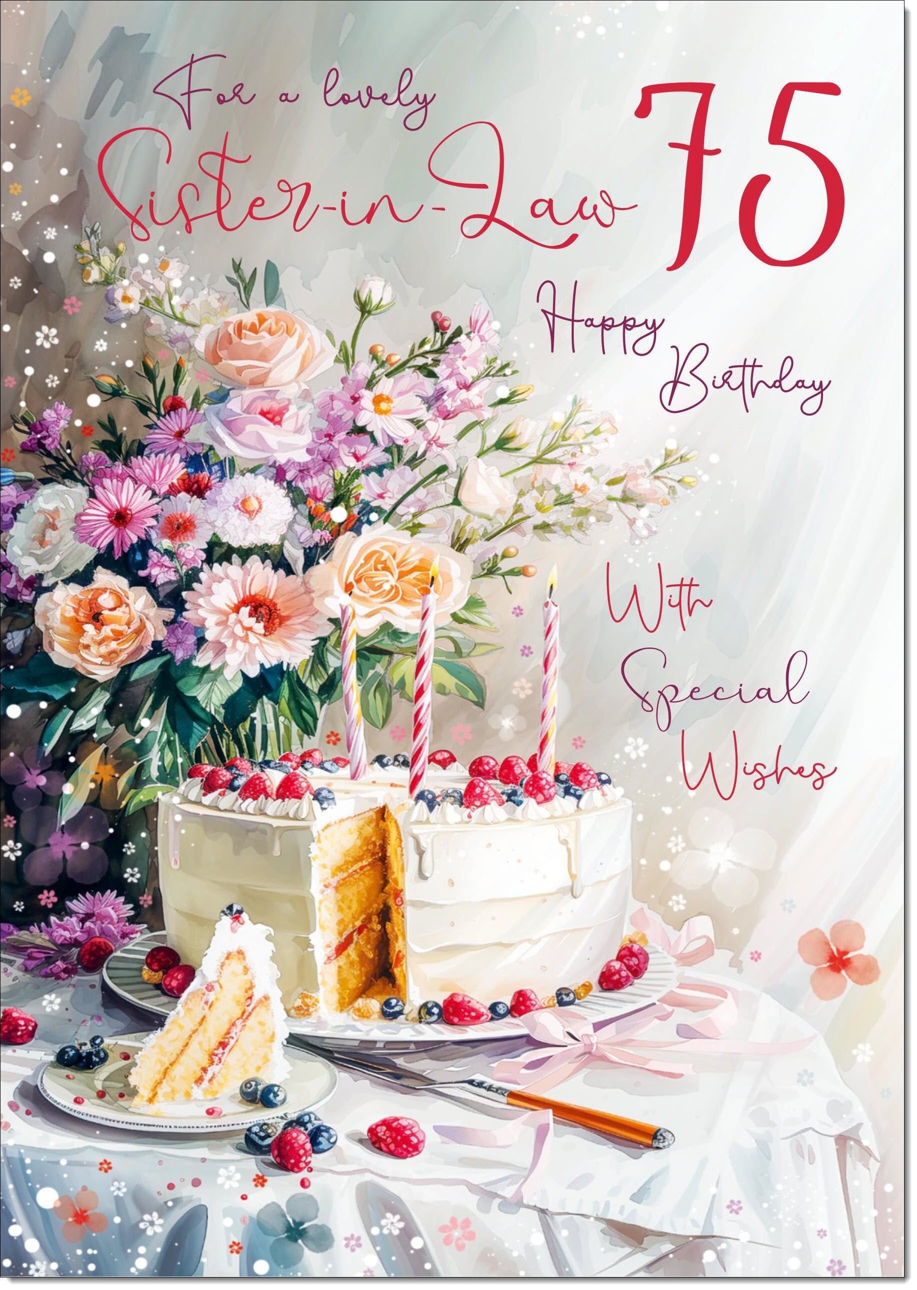 Sister-in-Law 75th Birthday Card Age 75 Birthday Cake and Flowers
