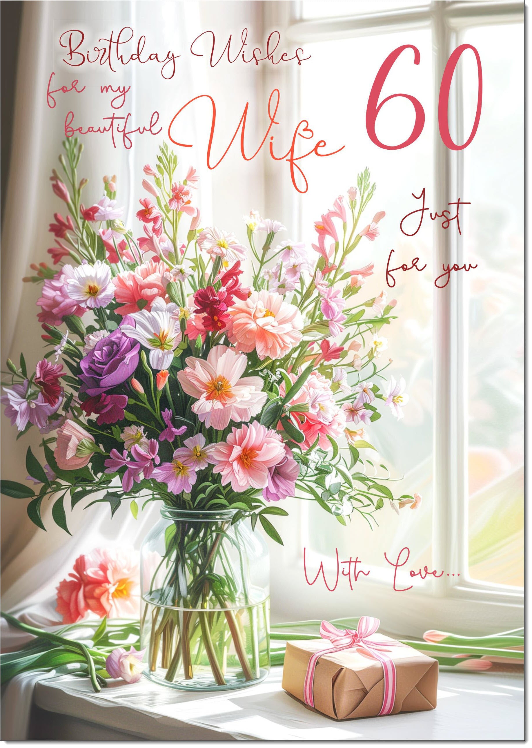 Wife 60th Birthday Card Age 60 Flower Bouquet and Present