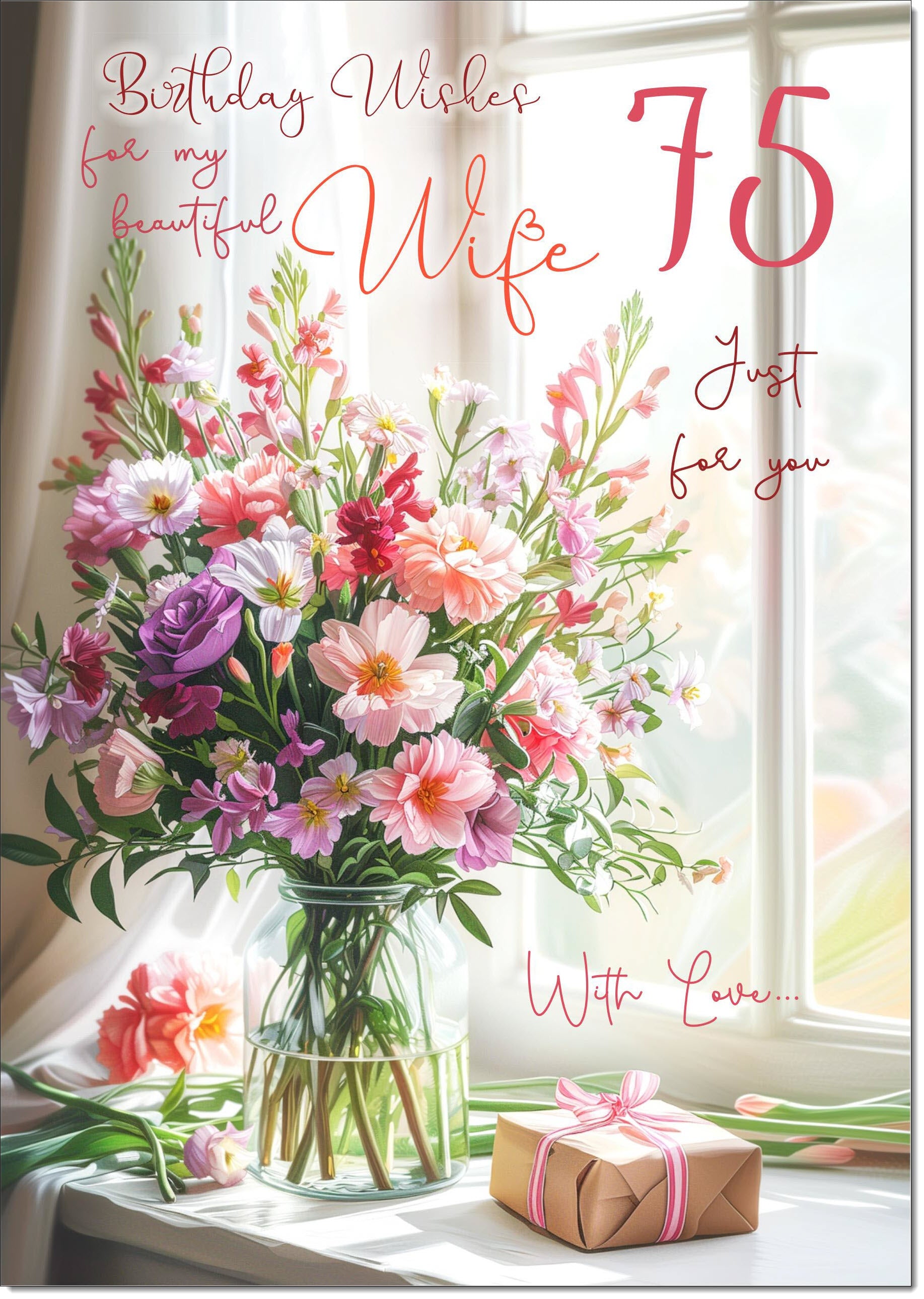 Wife 75th Birthday Card Age 75 Flower Bouquet and Present