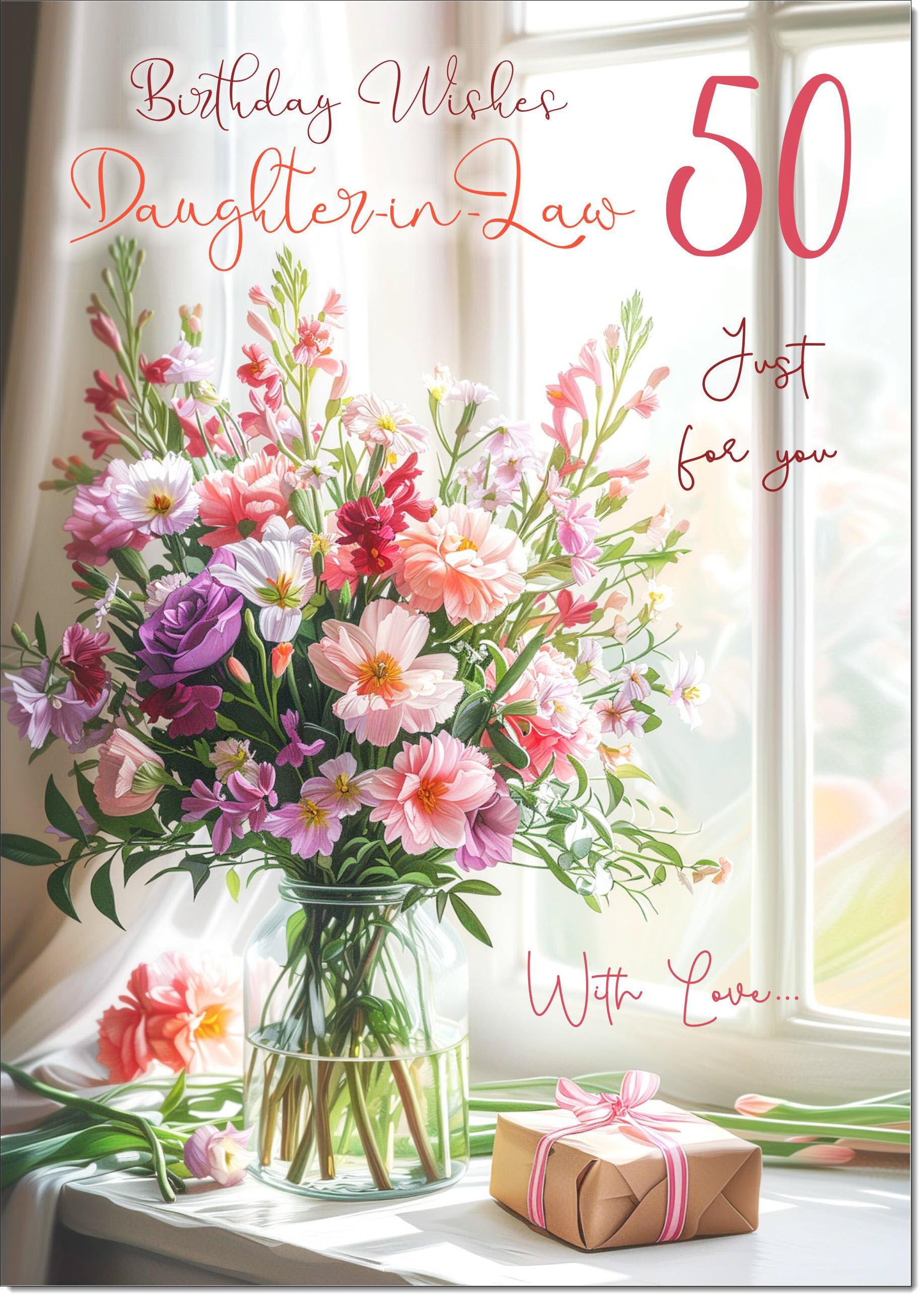 Daughter-in-Law 50th Birthday Card Age 50 Flower Bouquet and Present