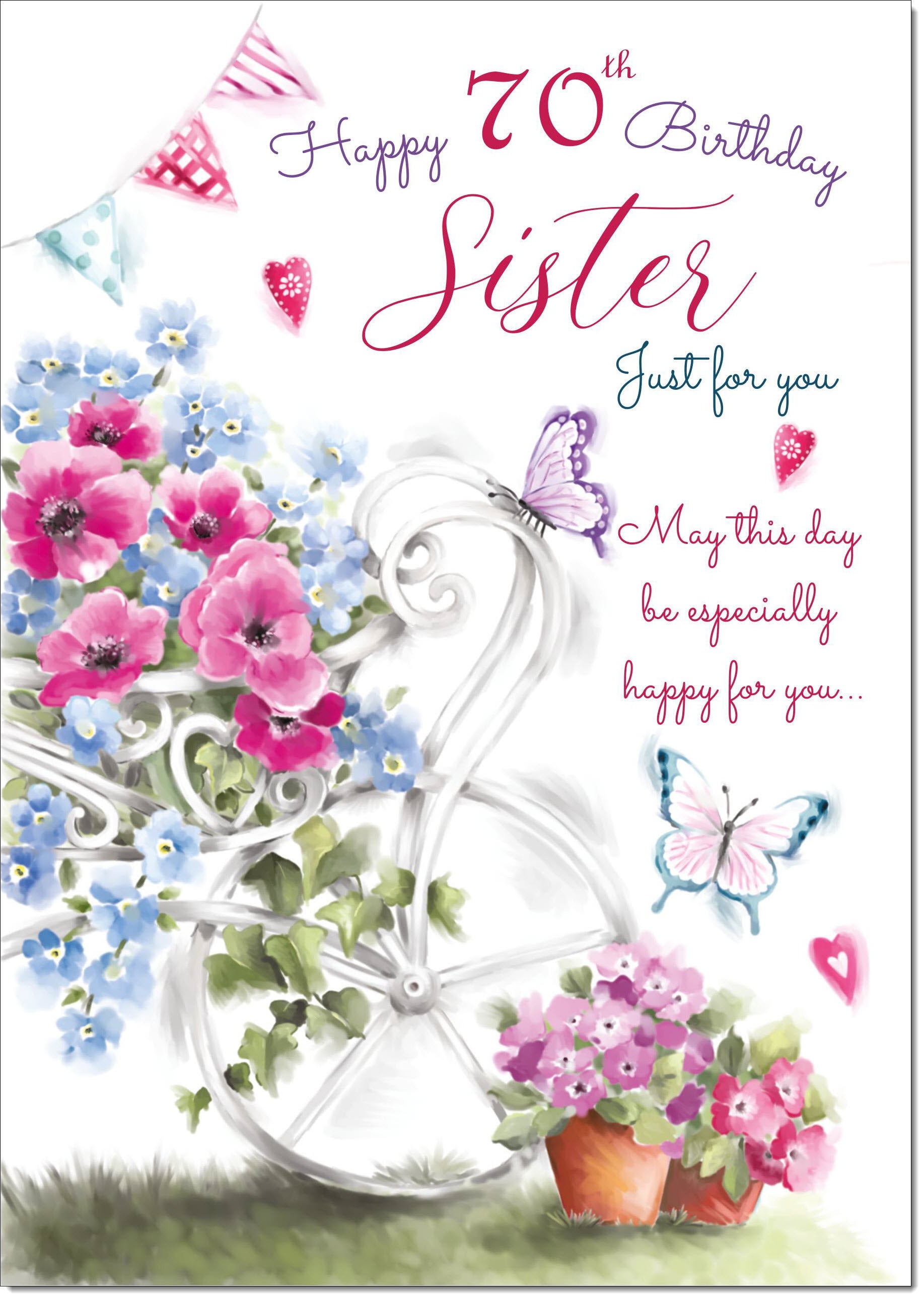 Sister 70th Birthday Card Age 70 Garden Wheelbarrow Bouquet