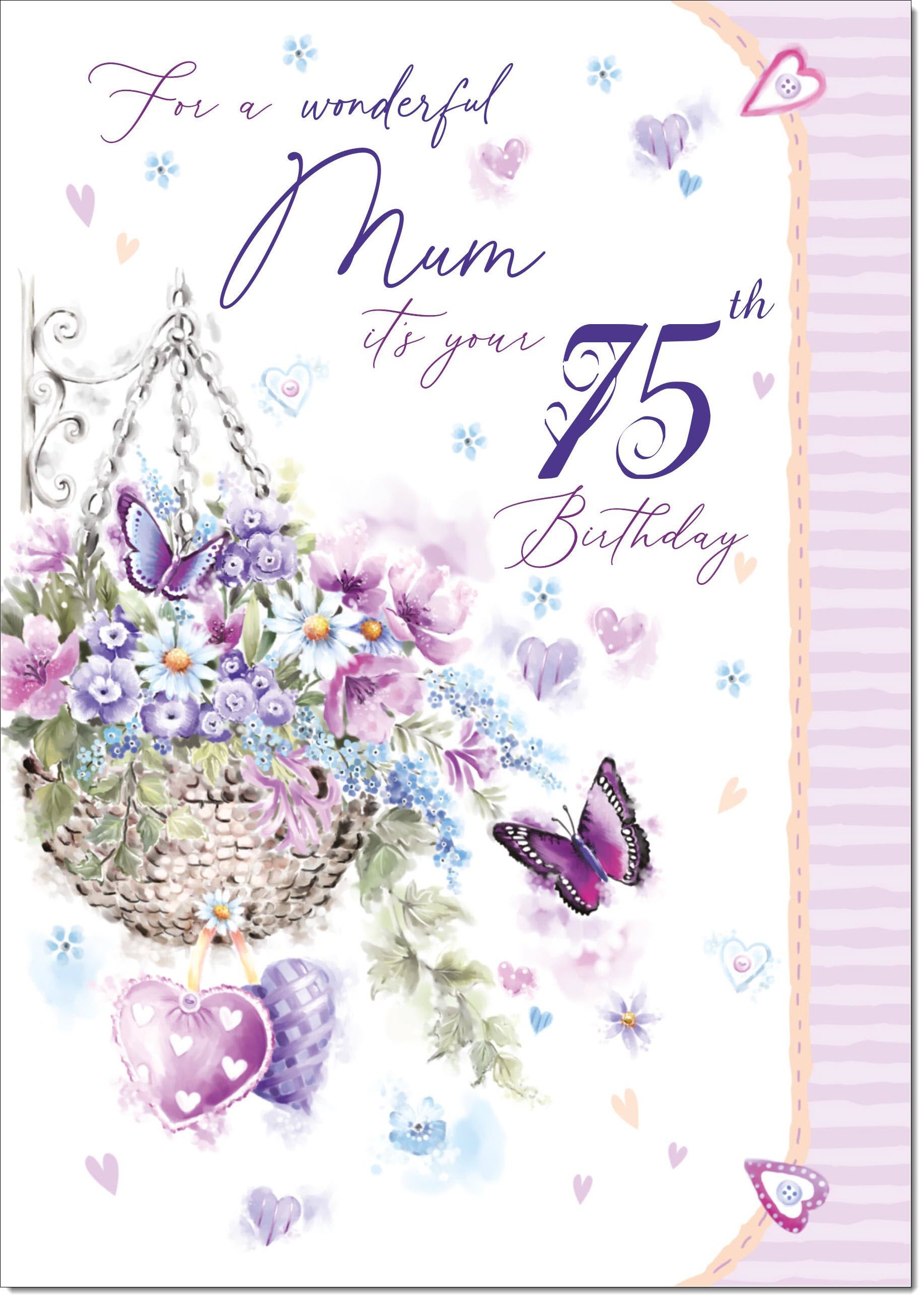 Mum 75th Birthday Card Age 75 Purple Hanging Basket