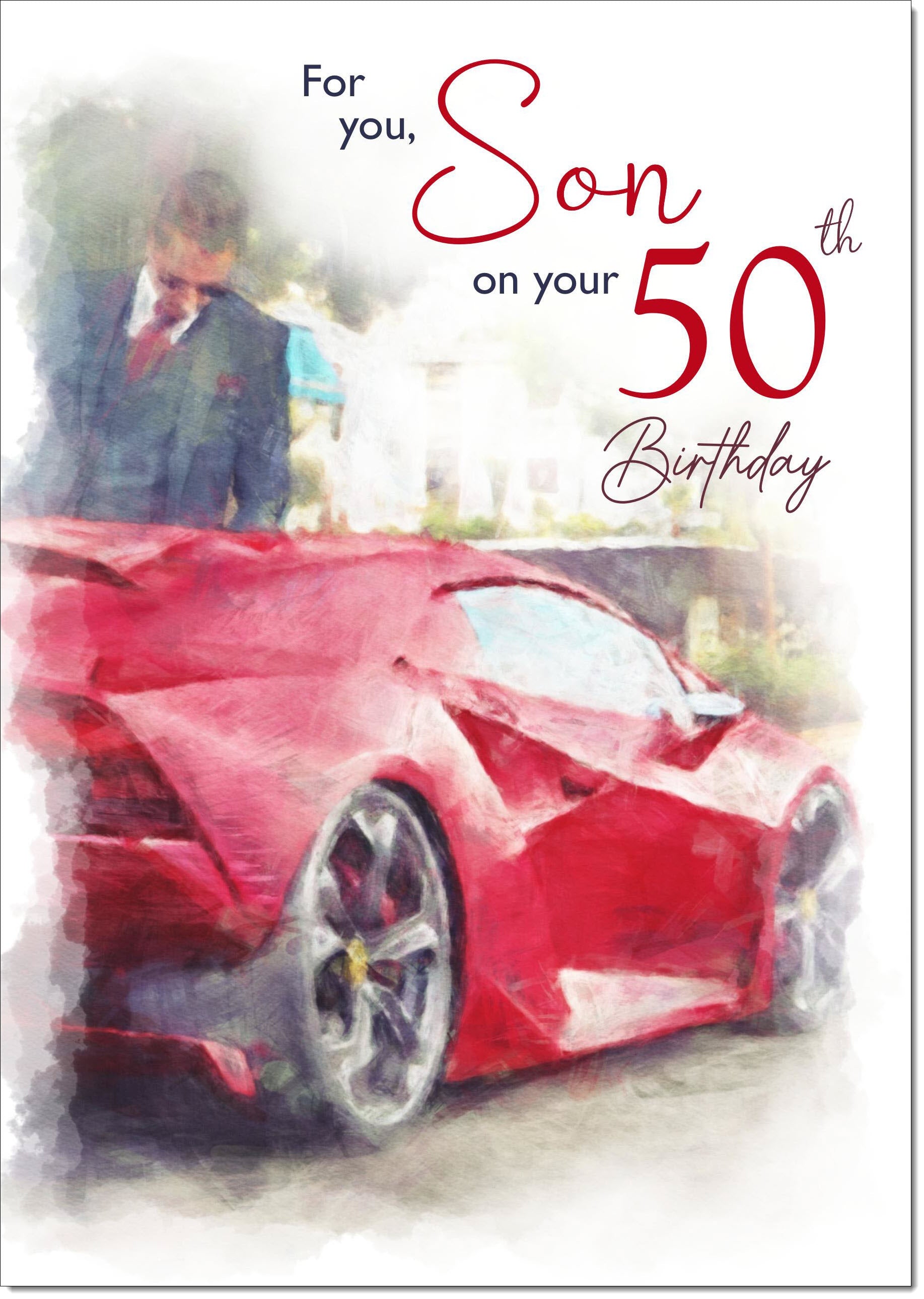 Celebrate your son’s milestone birthday with this stunning Son 50th Birthday Card Age 50 Supercar, designed to impress and delight. Crafted on premium Italian 350gsm board with a contemporary matt finish, this card effortlessly combines quality and style.