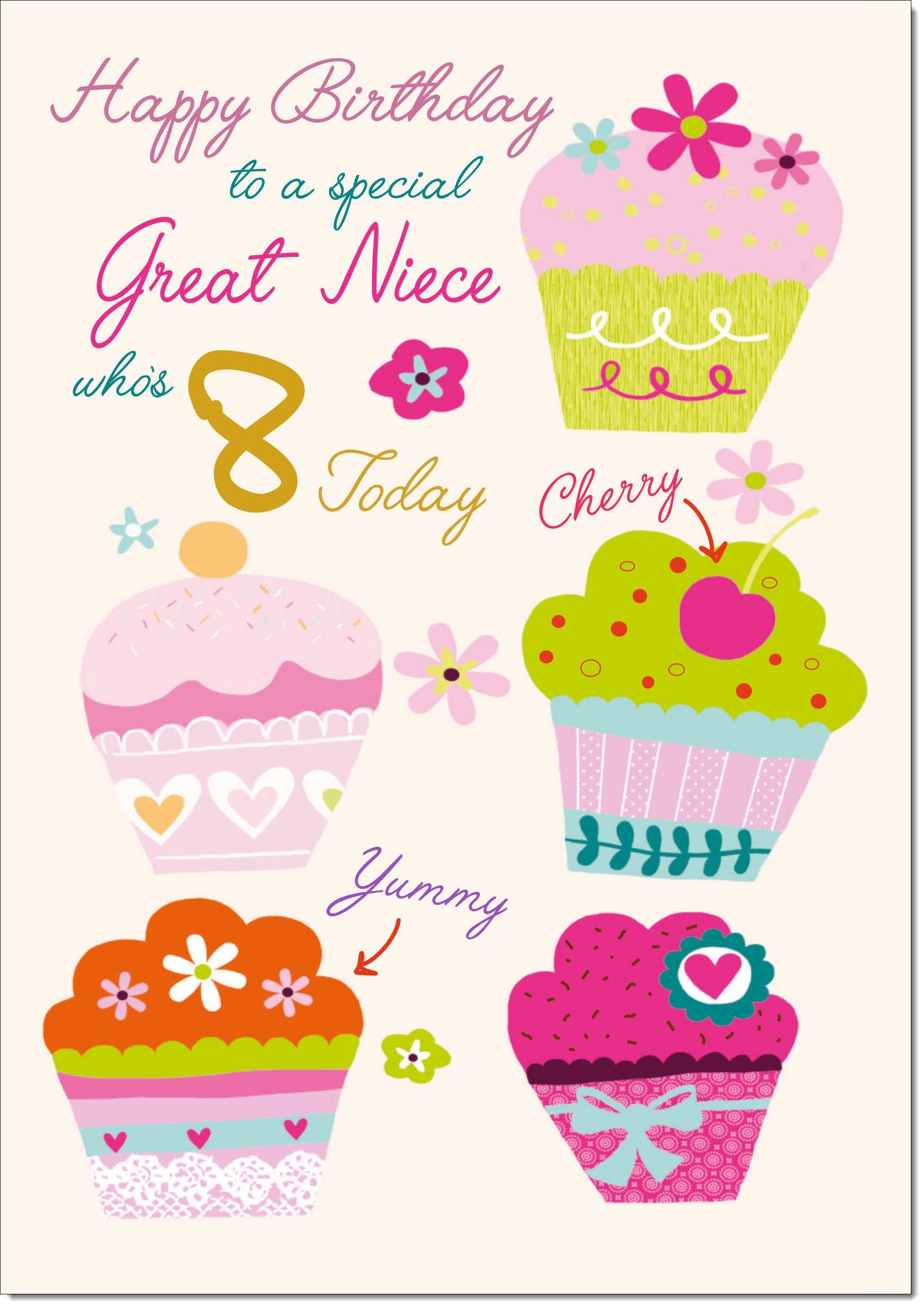 Great Niece 8th Birthday Card Age 8 Bright Cupcakes