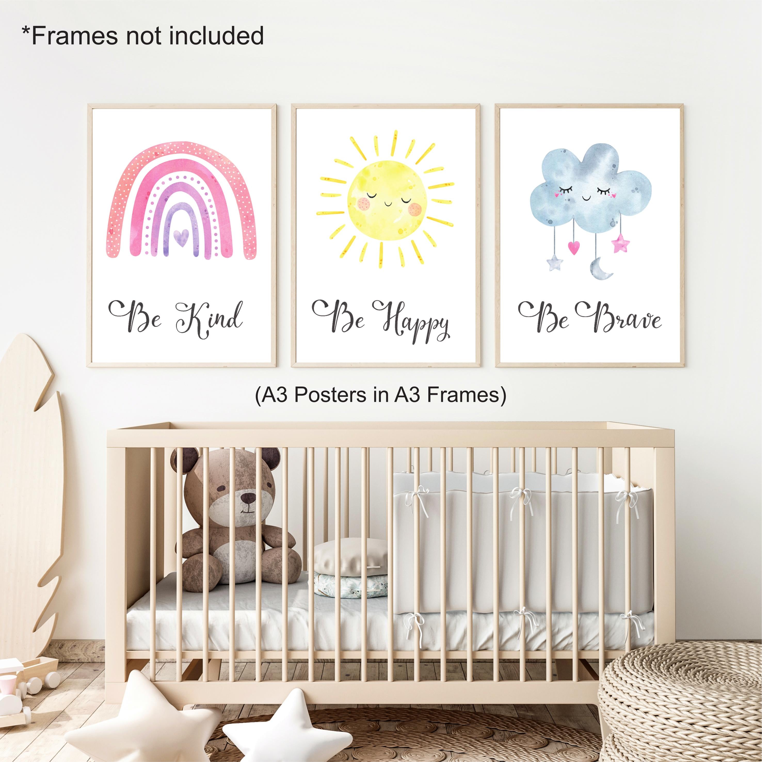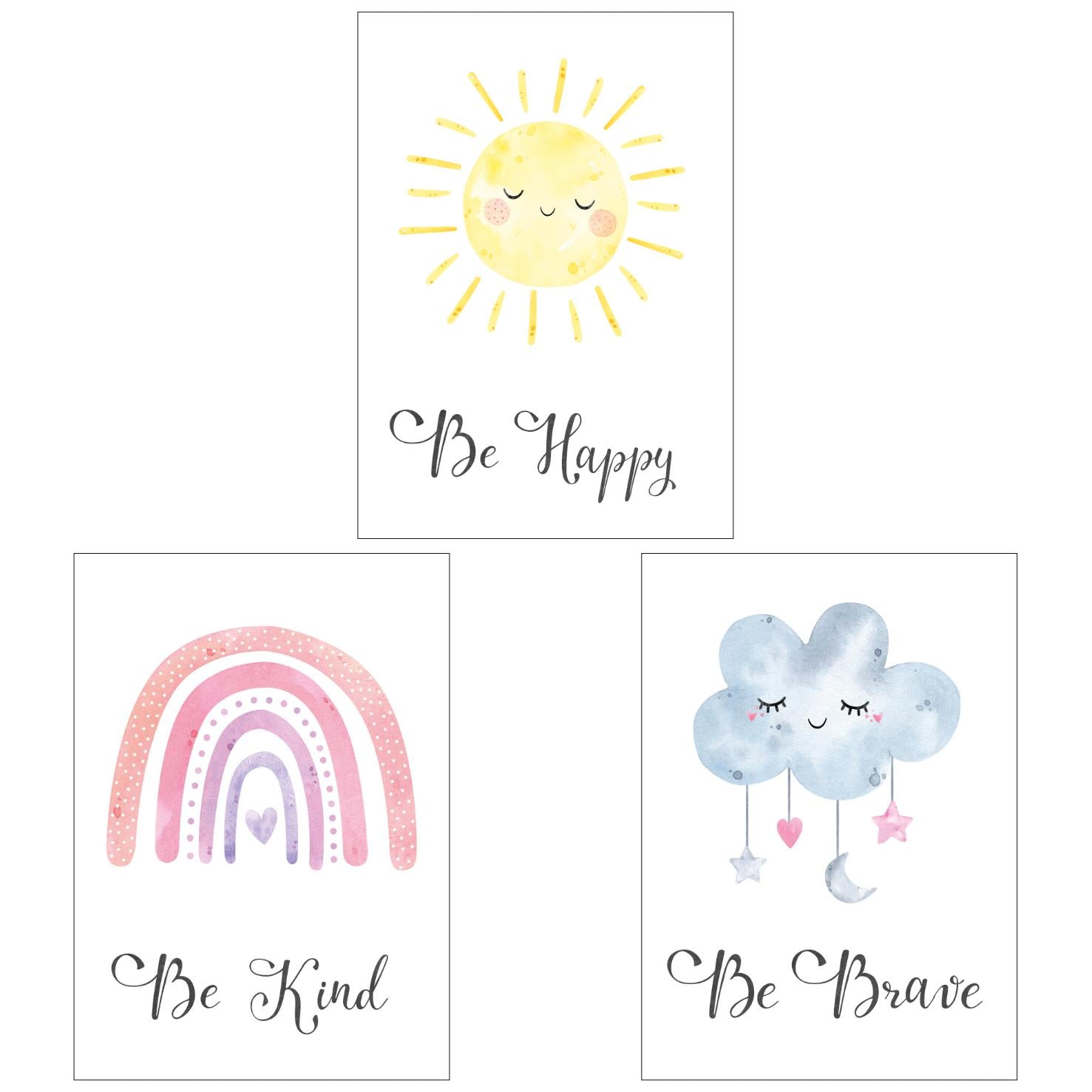 Set of 3 x A4 Size Nursery Be Kind Be Happy Be Brave Pink Unframed Quality Prints A4 or A3 Size (A4 210 x 297mm, A3 297 x 420mm)(A4 8.3 x 11.7", A3 11.7 x 16.5") Printed in the UK on 100% Recyclable Thick 350gsm Luxury Matt Board Supplied UNFRAMED but look great as they are. Delivered flat - not rolled. Ready to Frame - Easy to Purchase A4 or A3 Frames online. No cutting required.