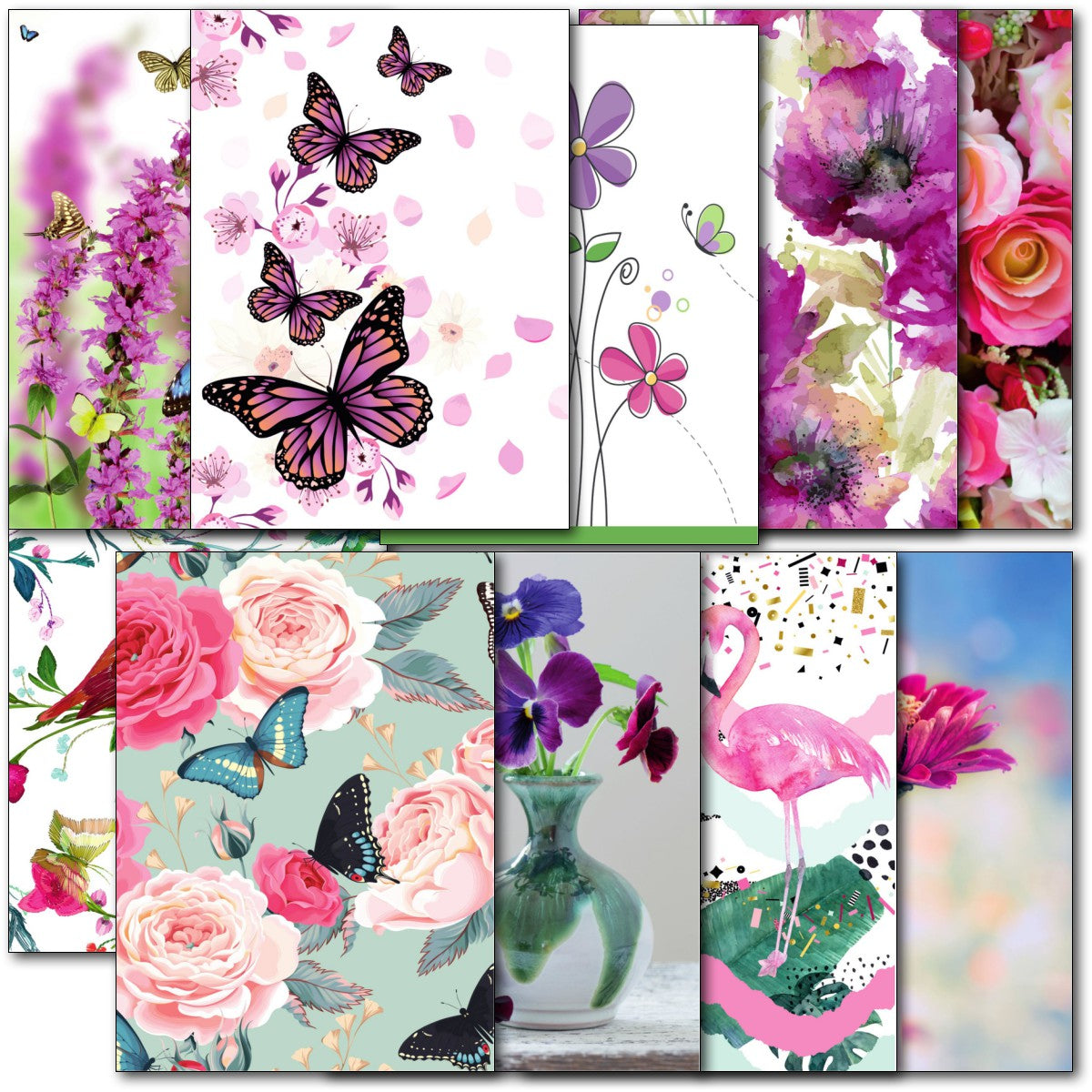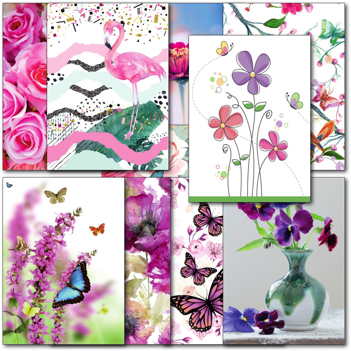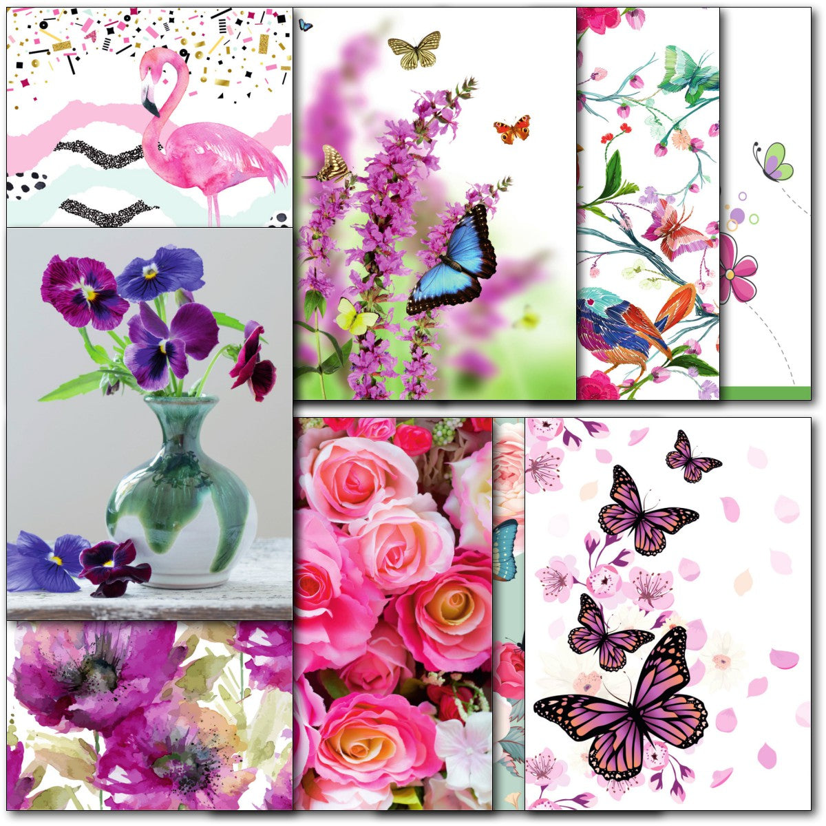 DESIGNS ⭐No more than one card of any design. Therefore pack consists of 10 different cards as shown. Flamingo, Butterflies, Birds, Flowers