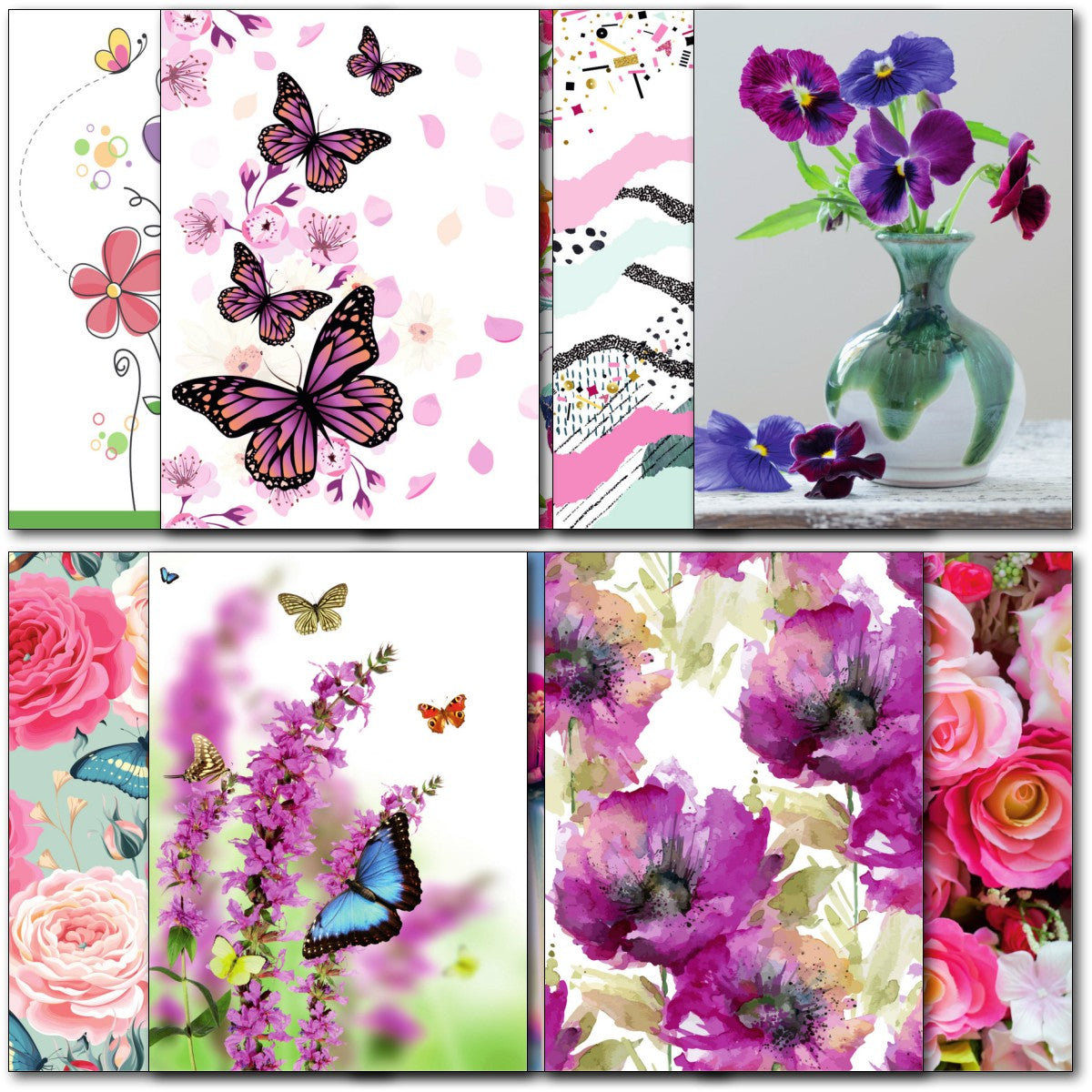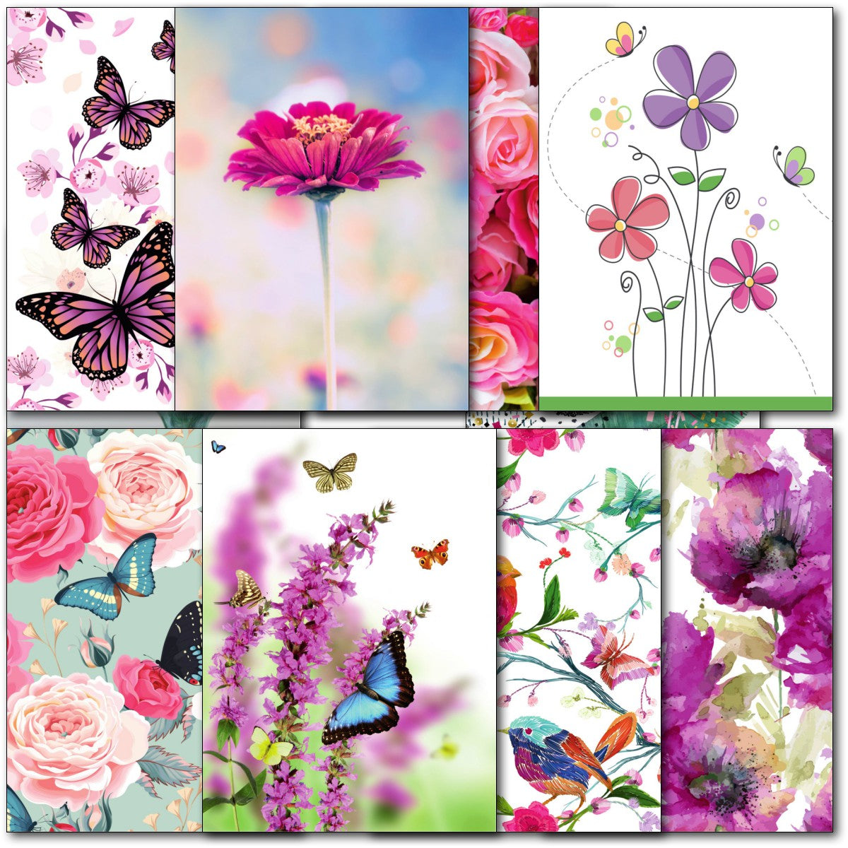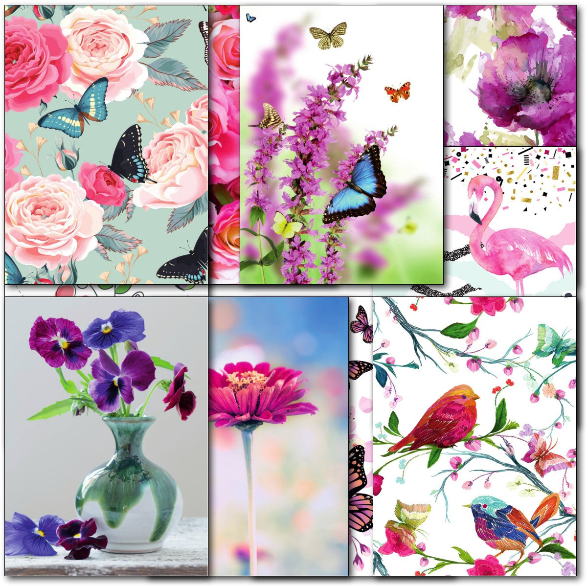 DESIGNS ⭐No more than one card of any design. Therefore pack consists of 10 different cards as shown. Flamingo, Butterflies, Birds, Flowers